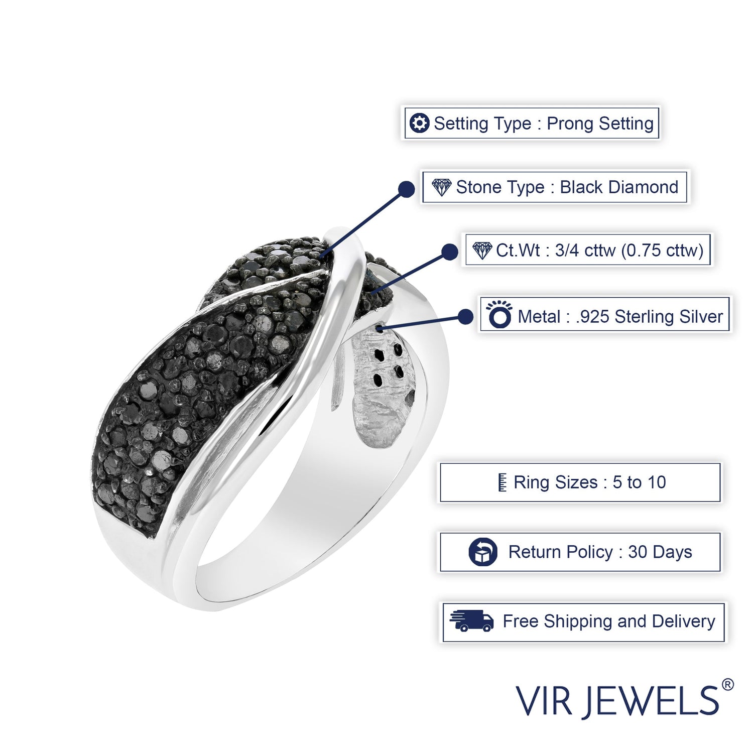 3/4 cttw Black Diamond Ring .925 Sterling Silver with Rhodium Plating
