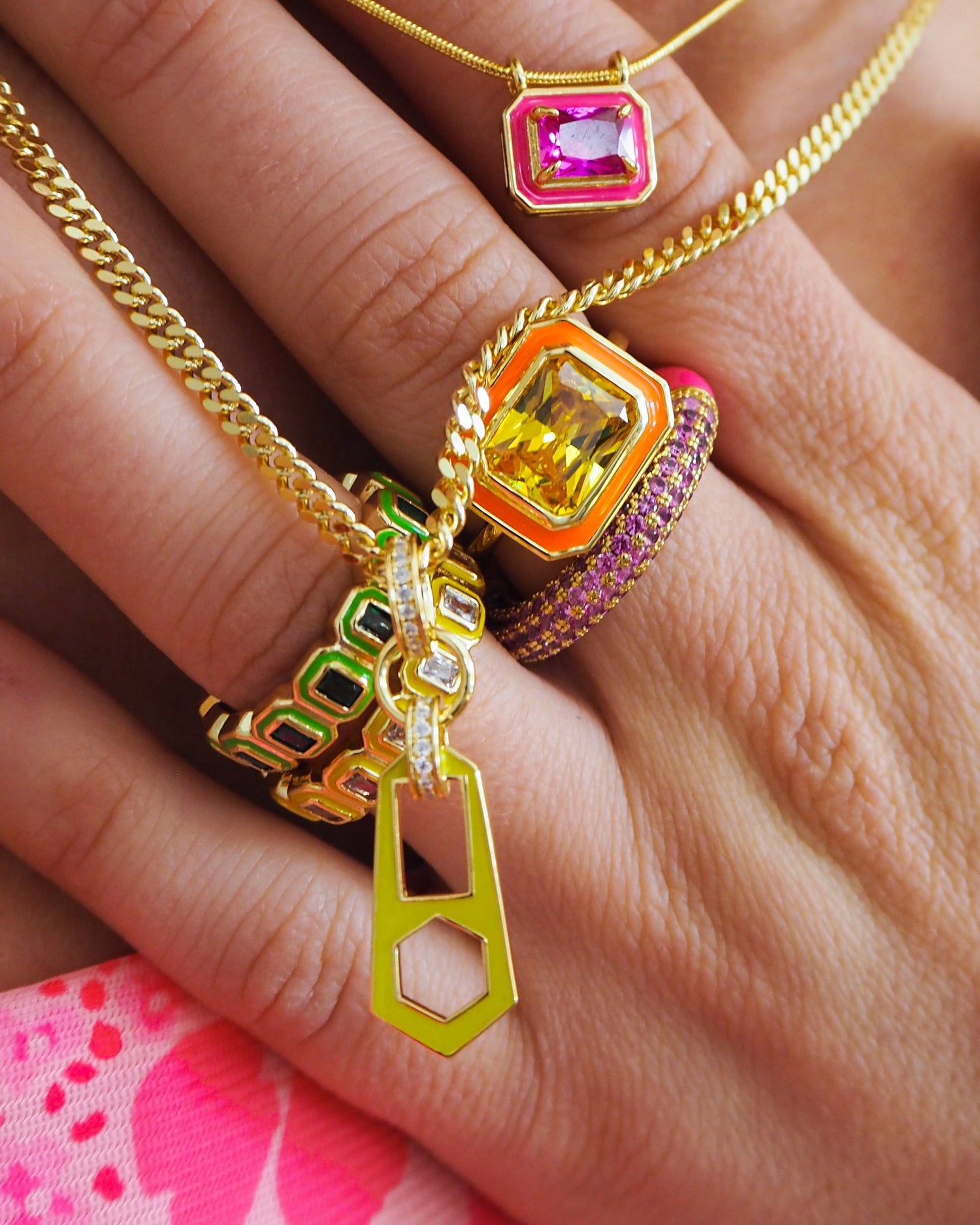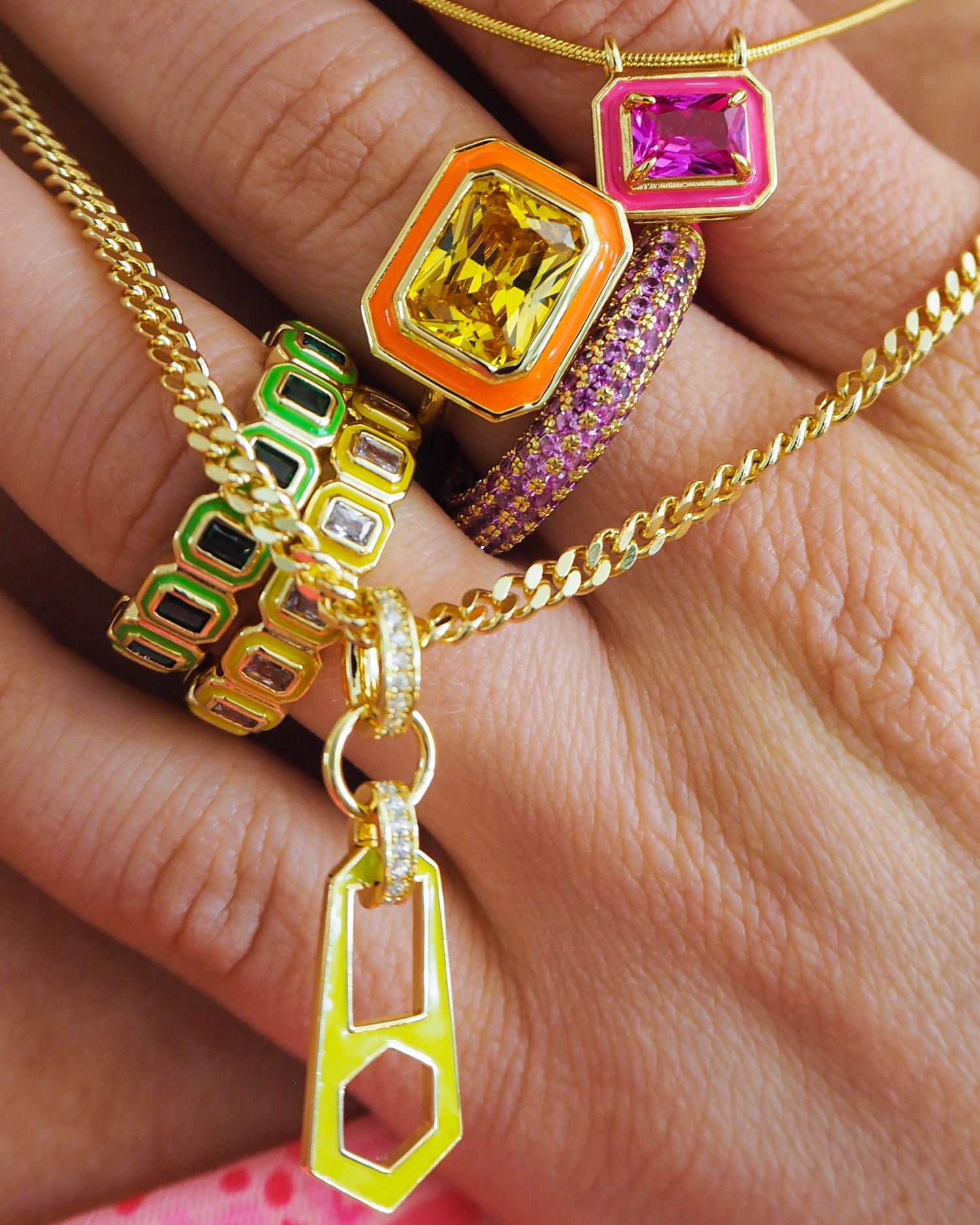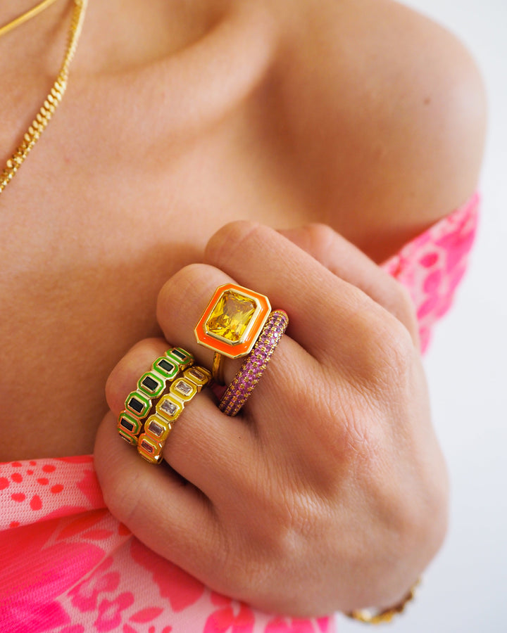 This Bezel Ballier Ring by Luv Aj in bright green is a bold statement piece that adds a pop of color to any outfit. The vibrant emerald green stone is framed by a bright green enamel bezel, creating a striking contrast. Crafted from brass and plated in gold, this ring features cubic zirconia stones that add extra sparkle. The ring’s adjustable design ensures a comfortable fit for most finger sizes, making it a versatile accessory for everyday wear or special occasions. The bold color and modern design make it a unique addition to any jewelry collection.