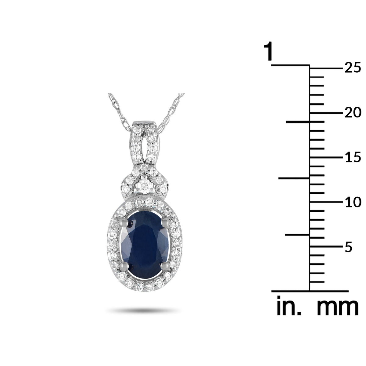 Made from 14K white gold with 0.15ct diamonds and a blue sapphire. Pendant measures 0.75' long x 0.35' wide.