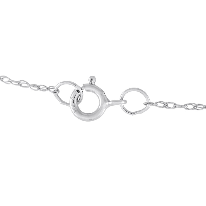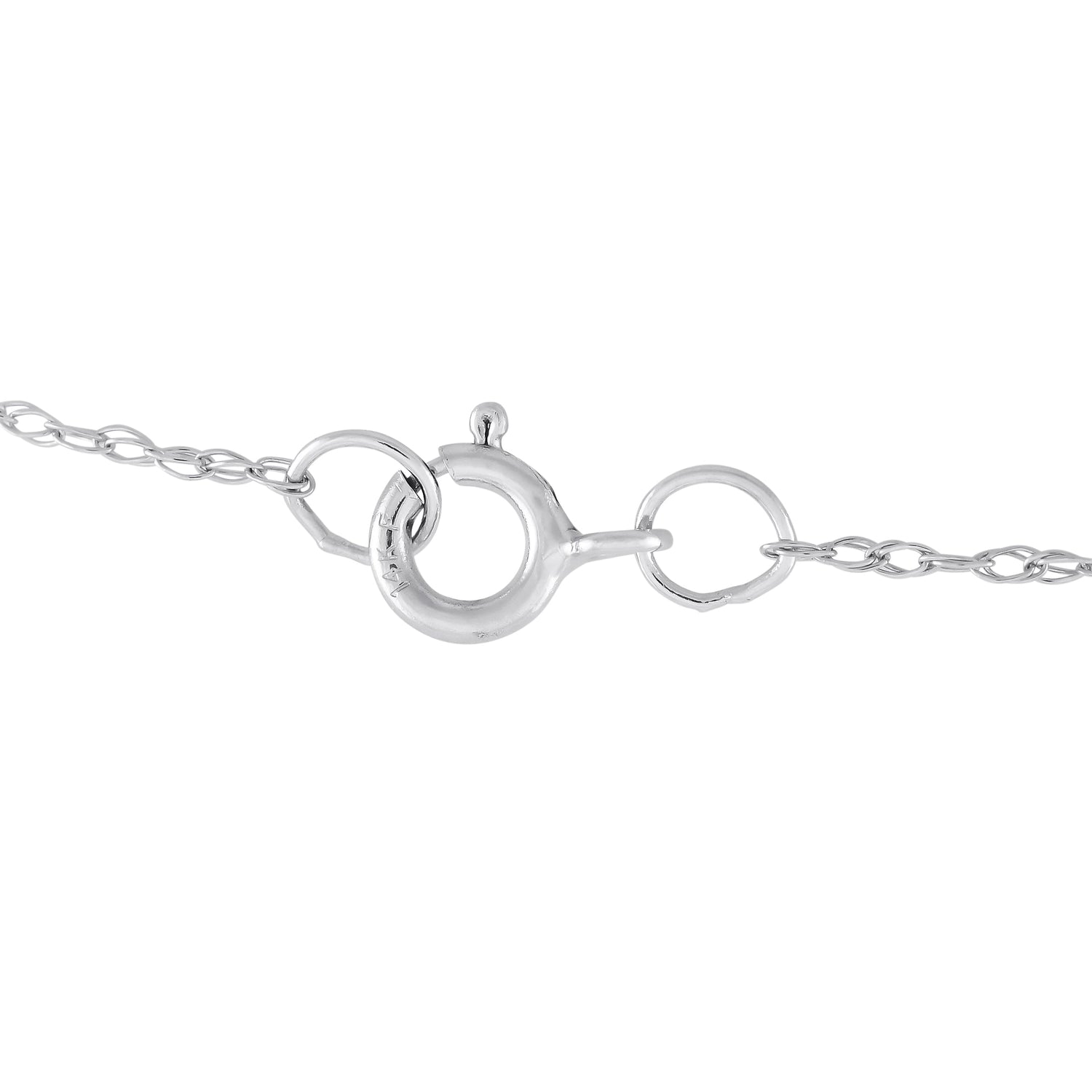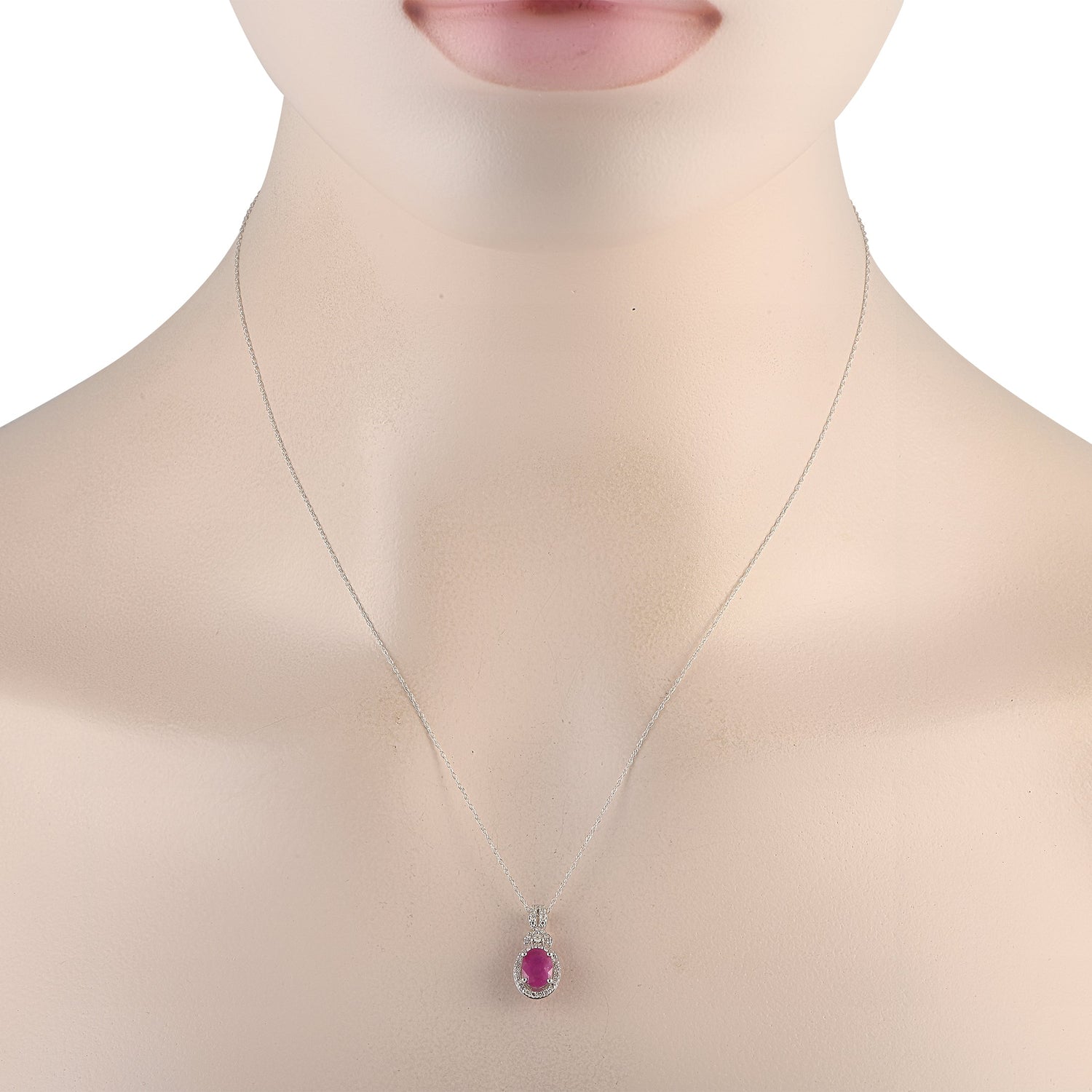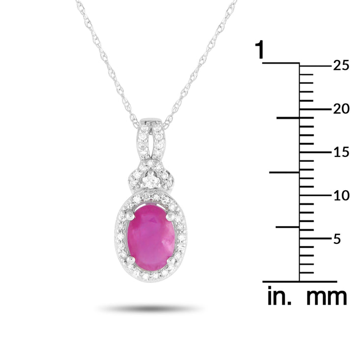 Made from 14K white gold, featuring a 0.15-carat total weight of diamonds surrounding a ruby. The pendant measures 0.75' long and 0.35' wide, suspended from an 18' chain.