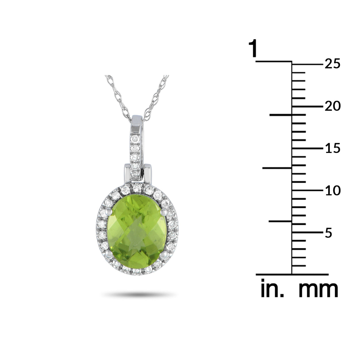 Crafted in 14K white gold with 0.13 carats of diamonds and an oval peridot center stone. Pendant measures 0.75 by 0.45 inches, includes an 18-inch chain with spring ring clasp.