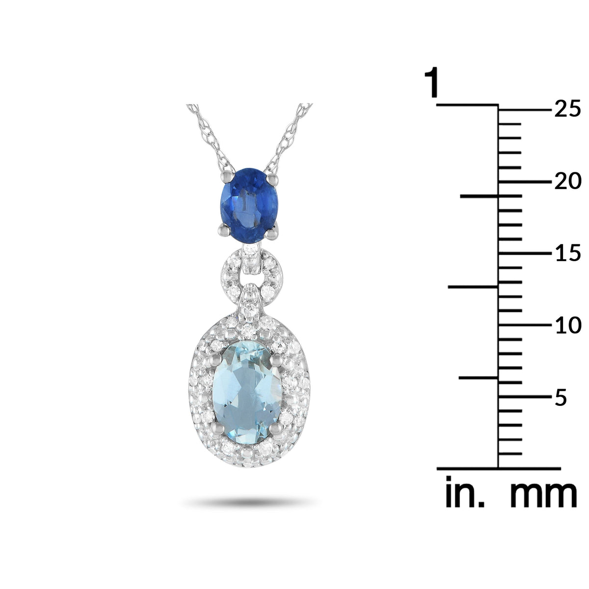This LB Exclusive 14K White Gold Diamond, Aquamarine, and Sapphire Pendant Necklace is a radiant piece that combines luxurious gemstones and craftsmanship. The oval-cut aquamarine and sapphire are complemented by diamond accents, totaling 0.08 carats, creating a vibrant and sophisticated necklace. This exquisite piece is perfect for adding color and elegance to any outfit.