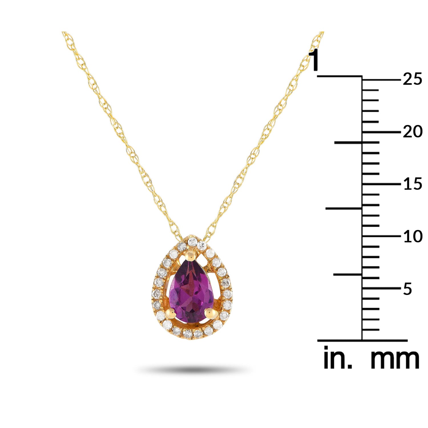 14K yellow gold, 0.07 carats of diamonds, rhodolite gemstone, 18-inch chain.