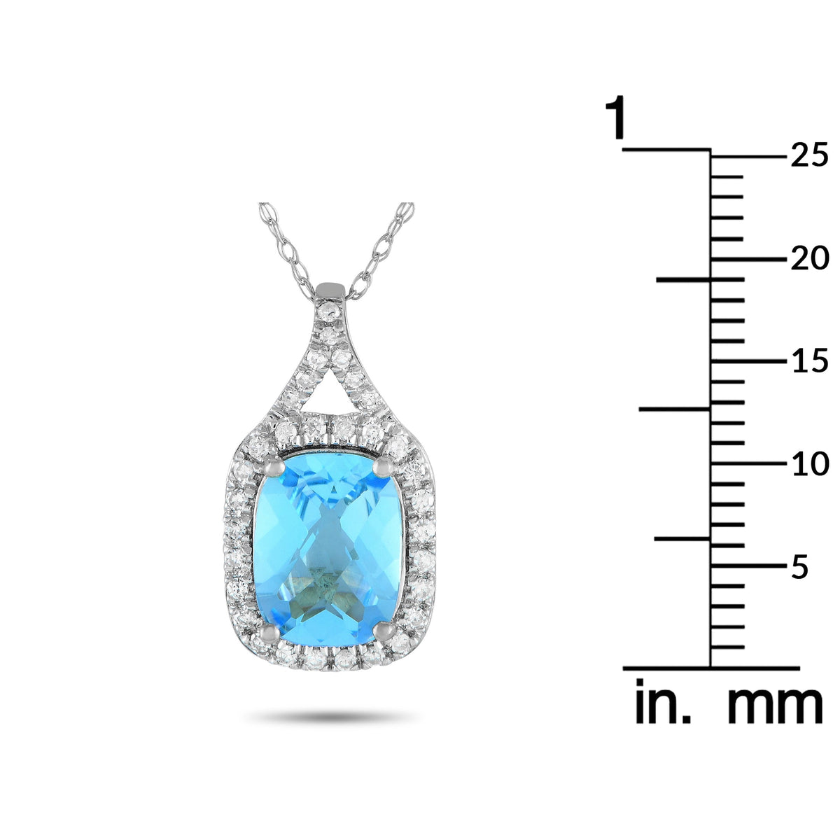 14K white gold pendant with 0.13 carats of diamonds and an aquamarine gemstone. Pendant measures 0.75' long and 0.45' wide, suspended on an 18' chain.