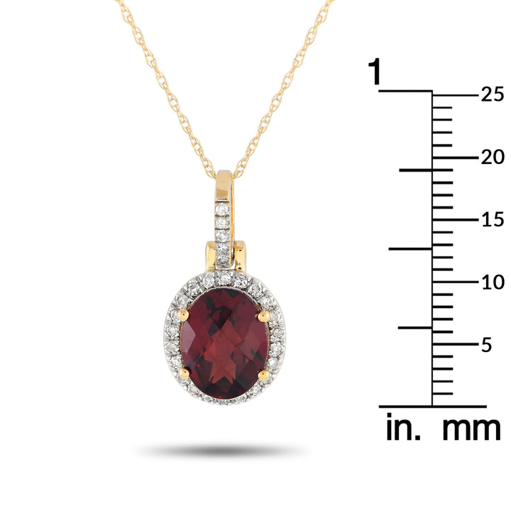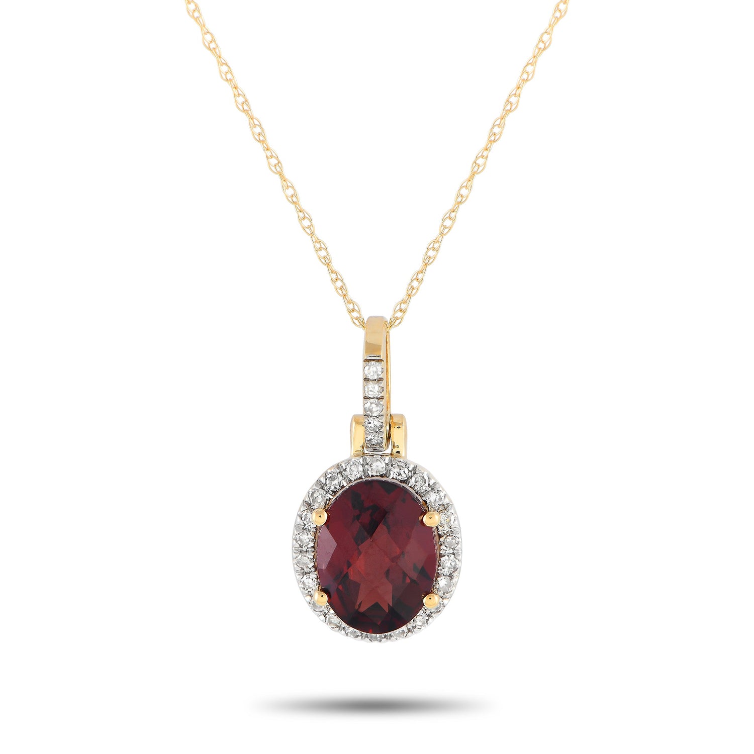This 14K Yellow Gold 0.13ct Diamond and Garnet Pendant Necklace by LB Exclusive is an elegant and striking piece. Featuring a captivating oval-cut garnet as its centerpiece, it is enhanced with sparkling diamonds totaling 0.13 carats. The 14K yellow gold pendant, suspended on an 18-inch chain, is the perfect balance of sophistication and luxury.
