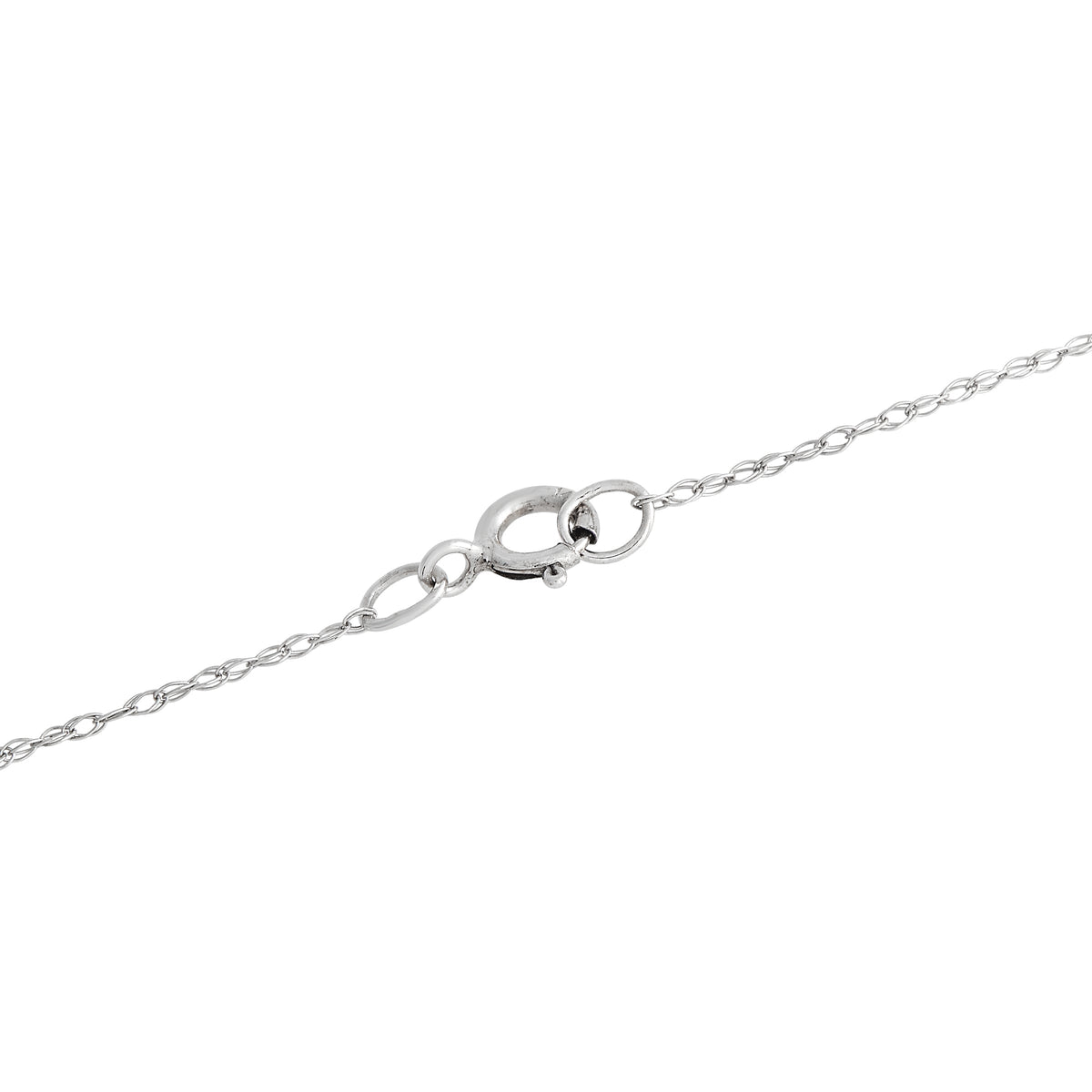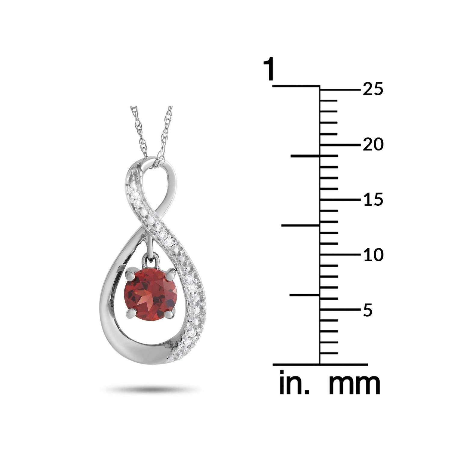 Crafted from 14K white gold with a round garnet gemstone and 0.03ct diamonds. Pendant measures 0.50 inches by 0.25 inches and hangs from an 18-inch double cable chain.