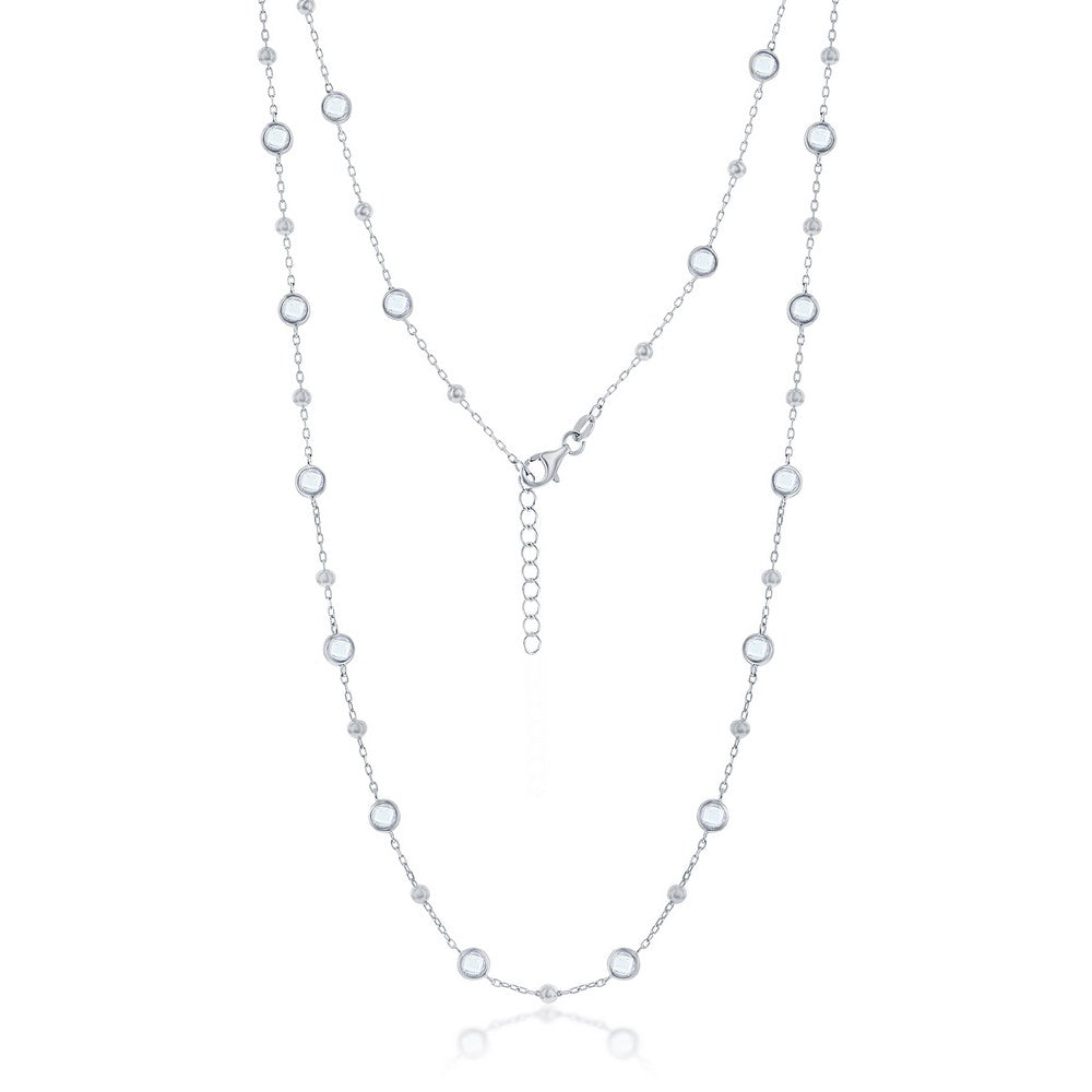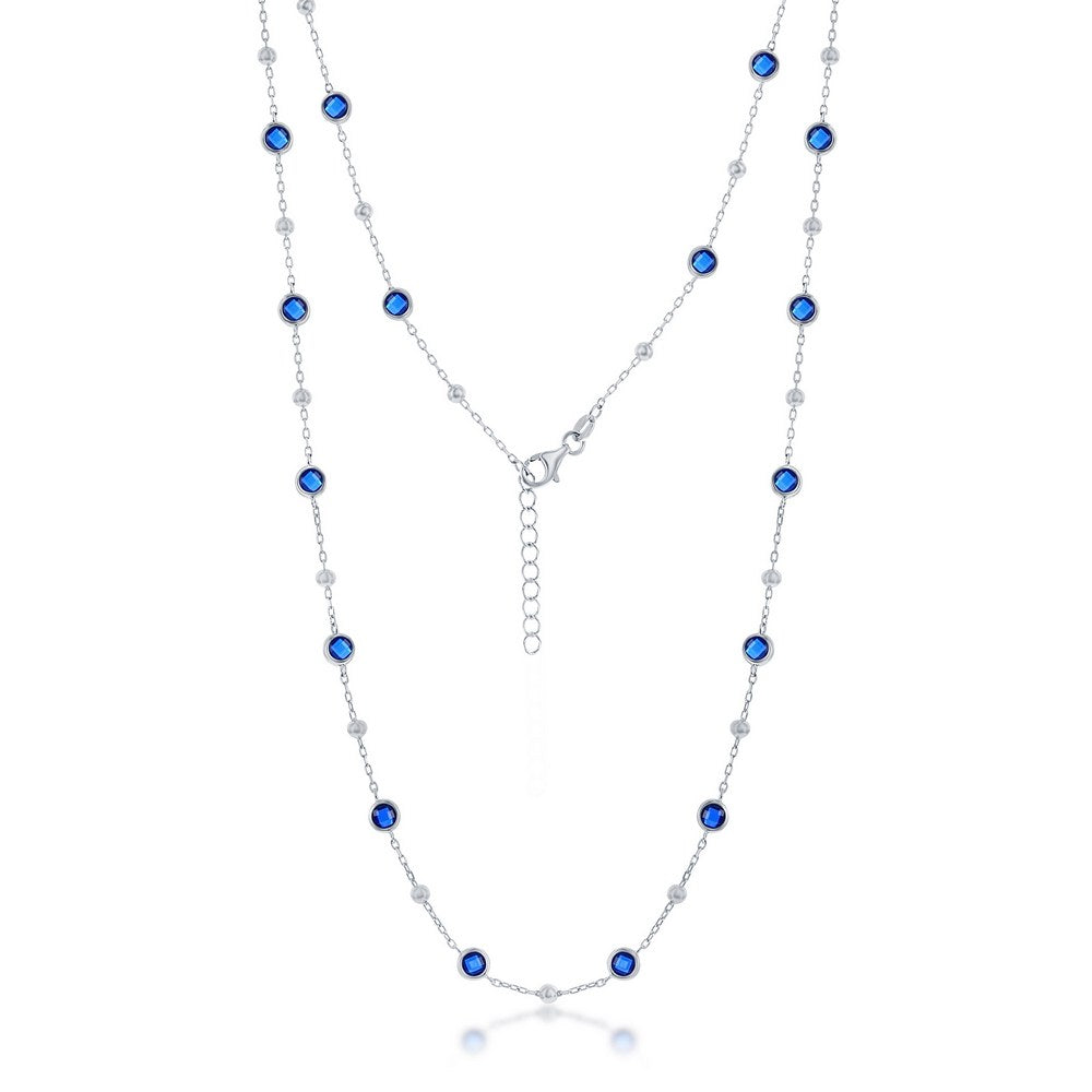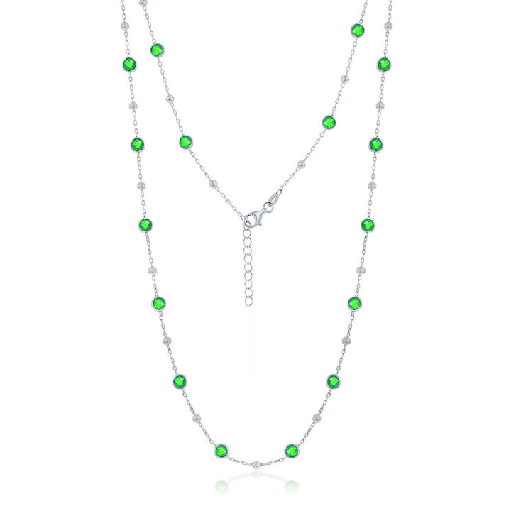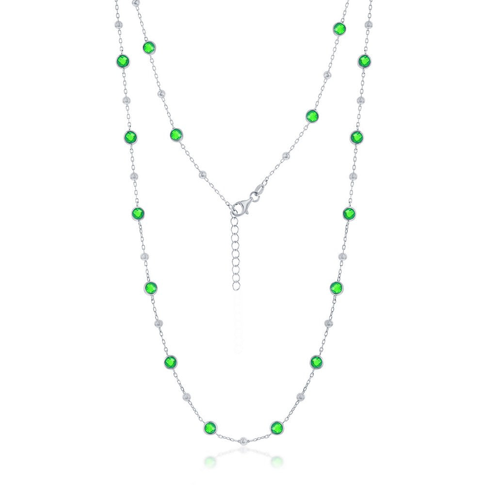 Sterling Silver Bezel-Set CZ & Bead Station Necklace (White, Green, Blue, Or Red)