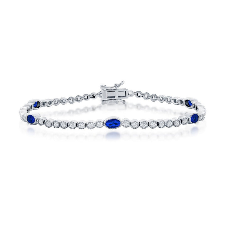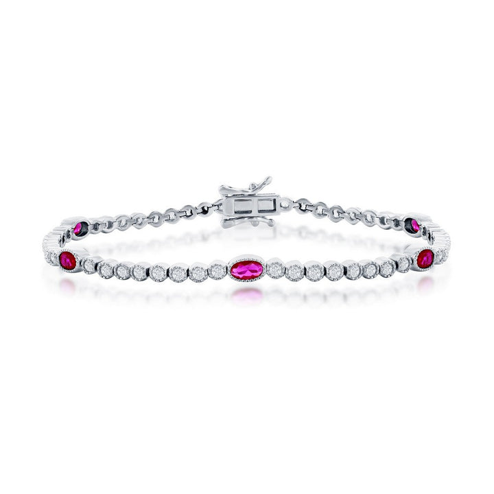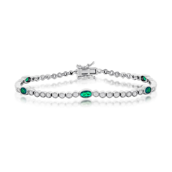 Sterling Silver Beaded Outline Round & Oval CZ Bracelet (Green, Blue, Or Red)