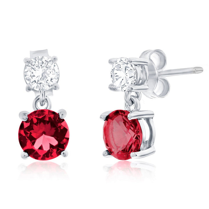 Sterling Silver Round CZ Dangle Earrings (Green, Blue, Or Red)