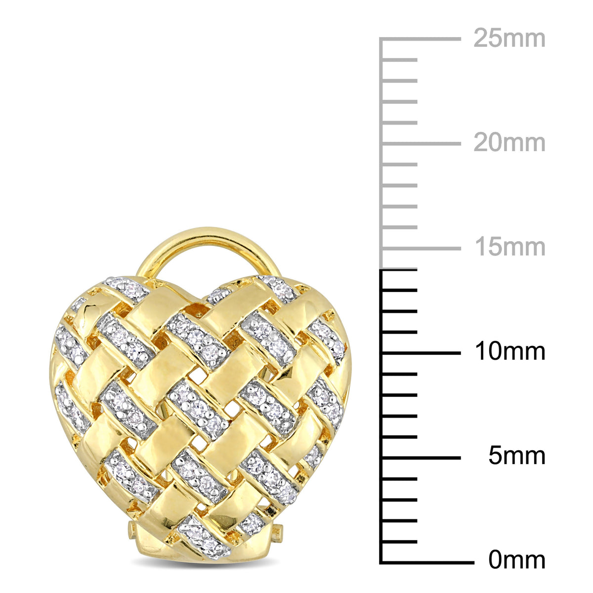 These Mimi & Max 1/4ct TDW Diamond Lattice Heart Omega Back Earrings in Yellow Plated Sterling Silver are a classic and elegant addition to any collection. The heart-shaped lattice design is timeless, while the diamonds add a touch of glamour and sophistication. Crafted from yellow-plated sterling silver, these earrings feature an omega back closure for comfort and security. Whether for a special event or as an everyday accessory, these earrings make a beautiful gift or personal treat.