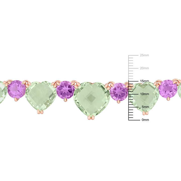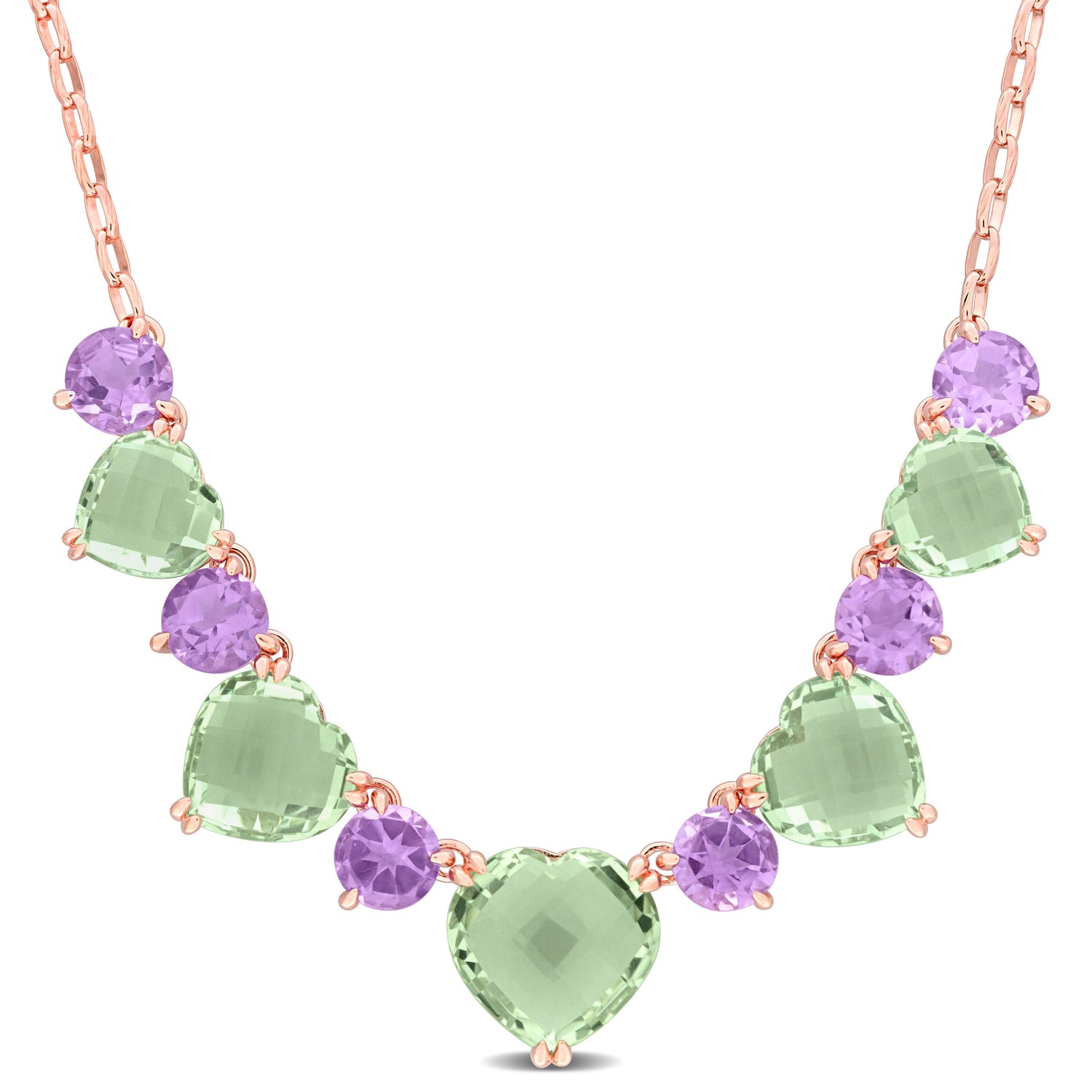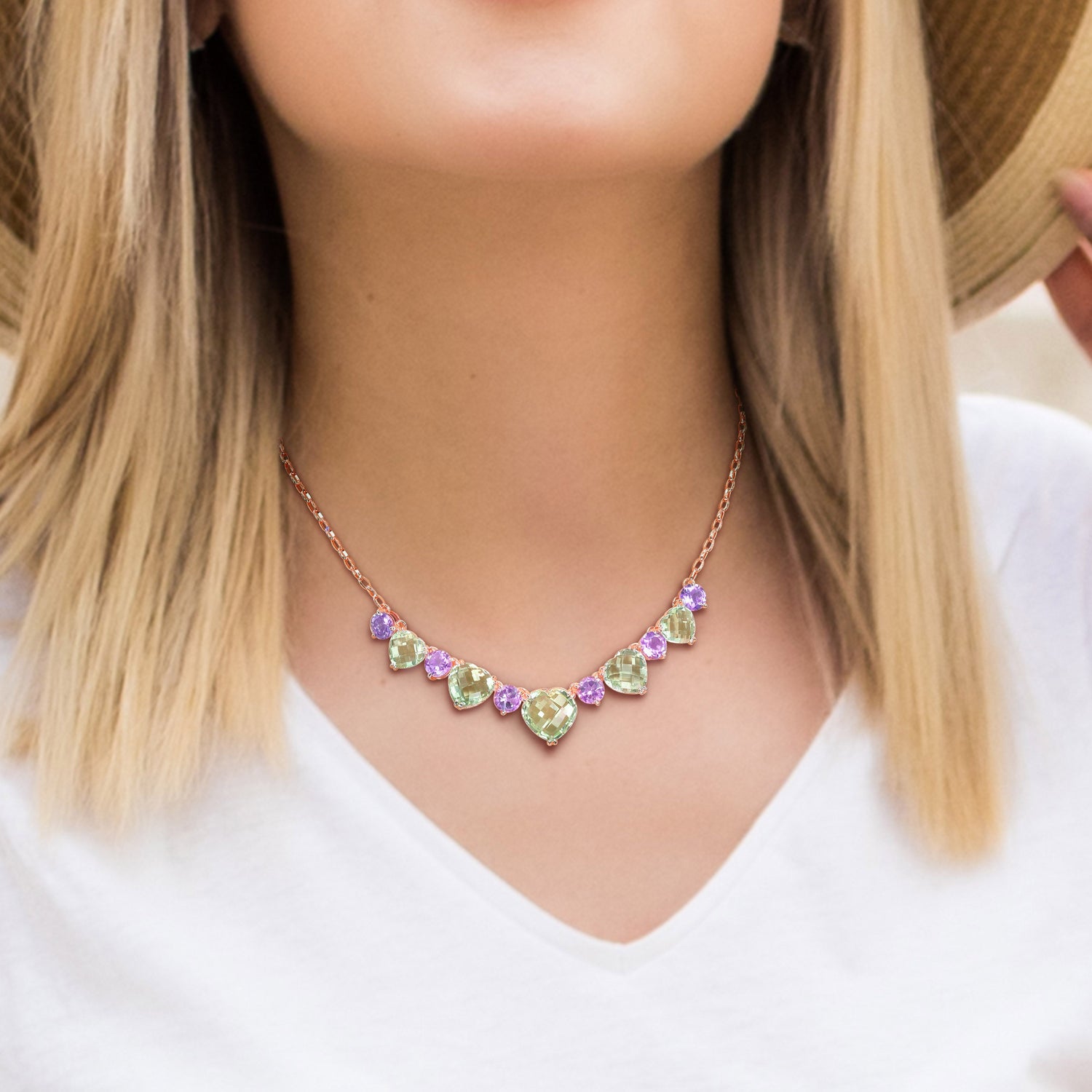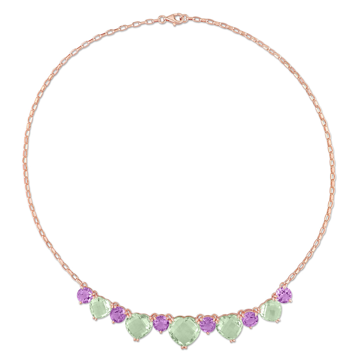 Crafted in rose-plated sterling silver featuring 36 5/8 total carats of green quartz and amethyst. Measures 17 inches in length with a lobster clasp.