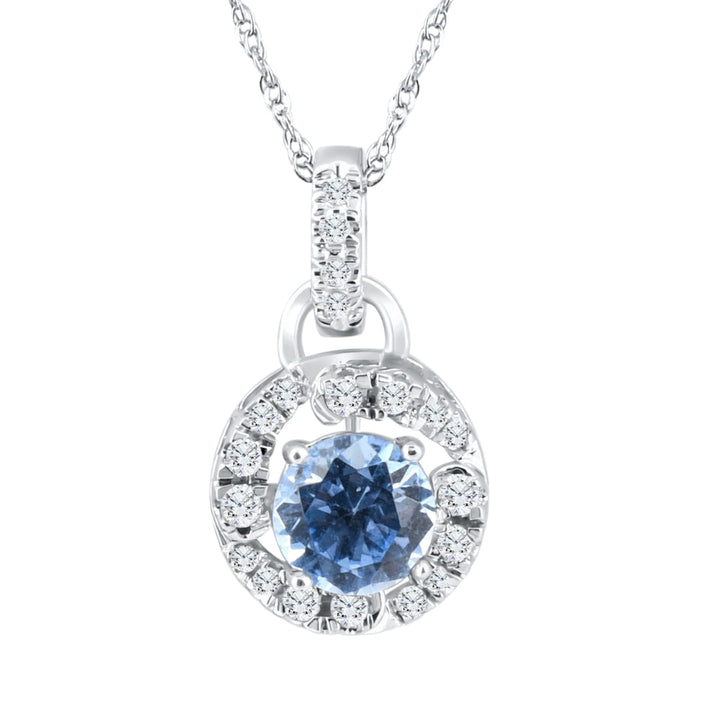 Set in 10k white gold with a 5mm round-cut aquamarine center and 20 round brilliant-cut natural diamonds (G-H color, I2-I3 clarity). Includes an 18-inch 10k white gold chain.