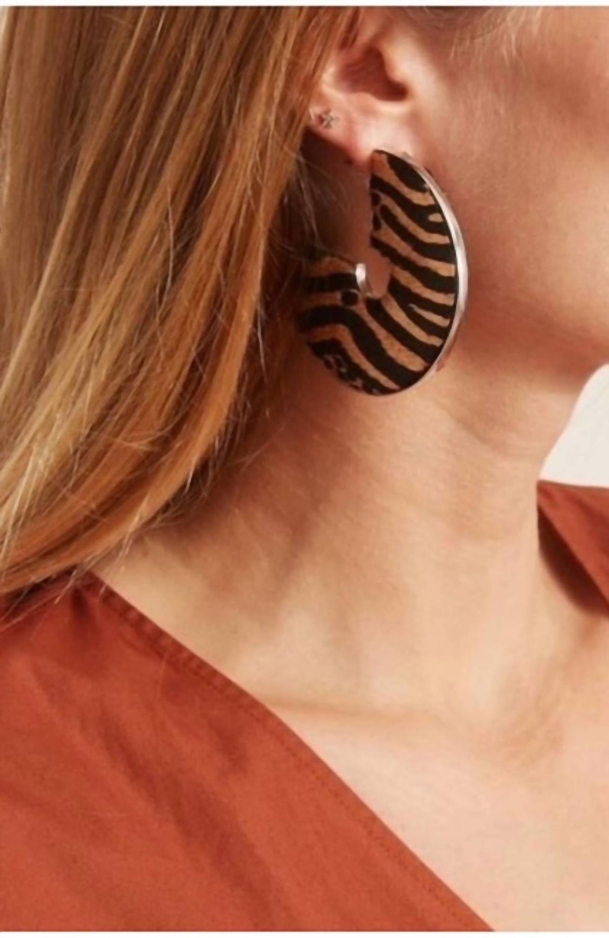 These Animal Mega Hoop Earrings in Nude Zebra by Mignonne Gavigan bring a playful yet sophisticated touch to your outfit. Featuring a multicolor zebra pattern incorporating black and beige, these earrings add an edgy vibe with studs and spikes, making them perfect for casual occasions where you want to make a bold statement.