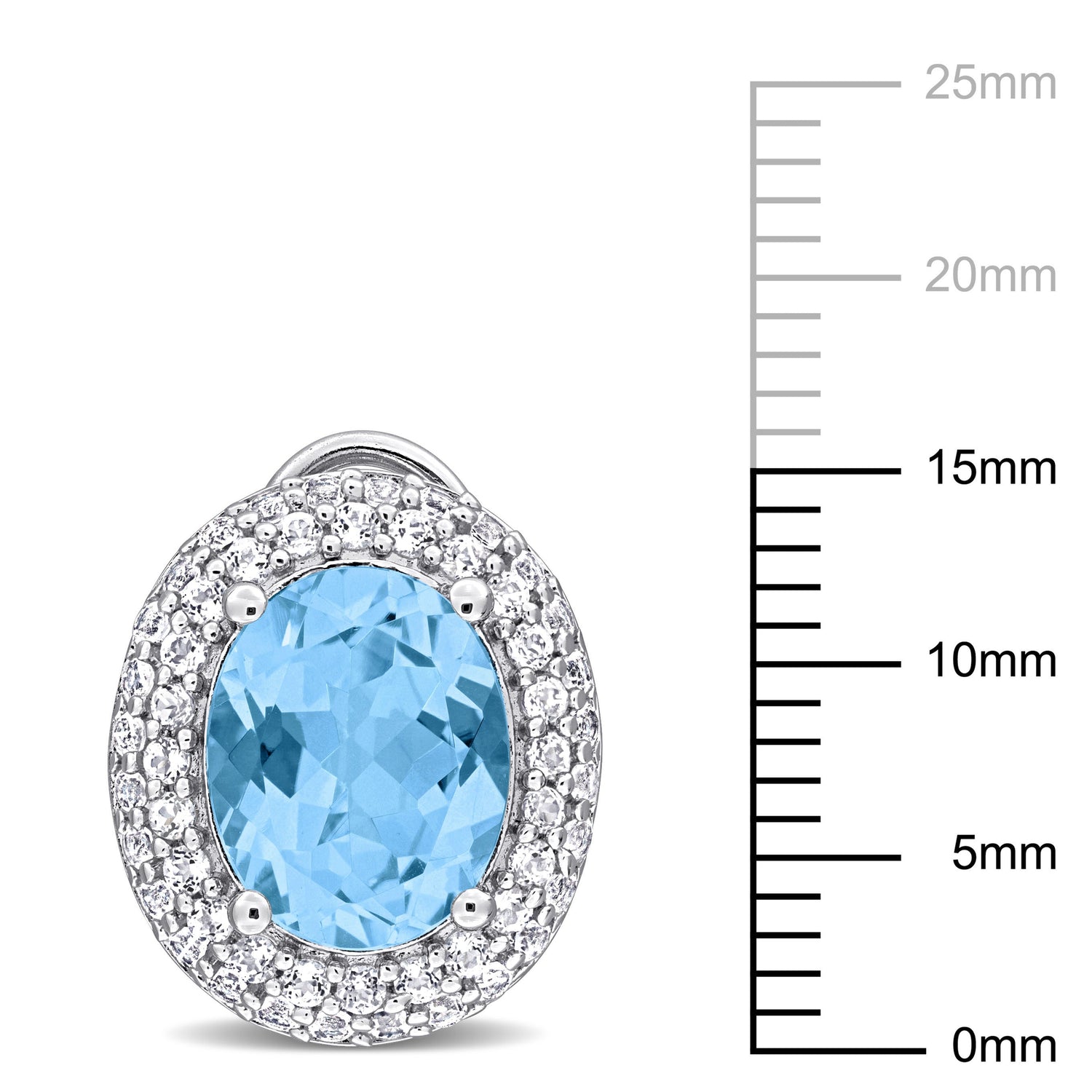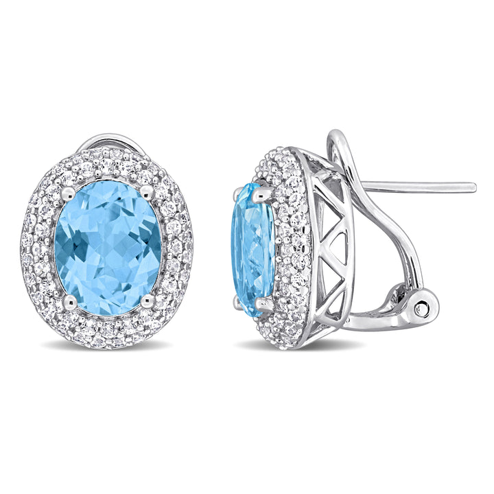 Crafted in sterling silver with oval-cut sky blue topaz (8 5/8ct TGW) and white topaz halos. Leverback closures provide a secure and comfortable fit.