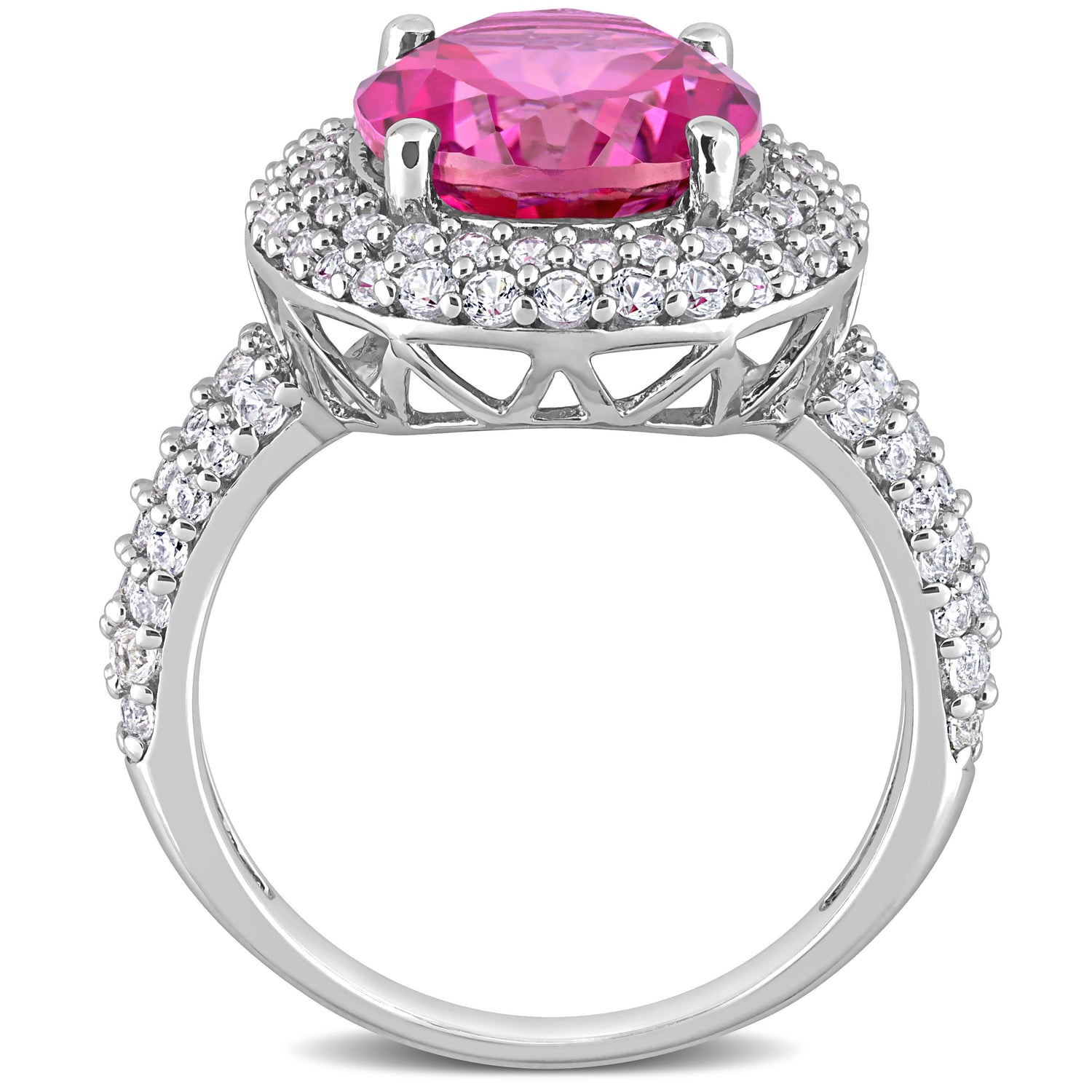Crafted in sterling silver with 7 1/7 ct. t.w. pink topaz and created white sapphires. Features a double halo setting for enhanced brilliance.