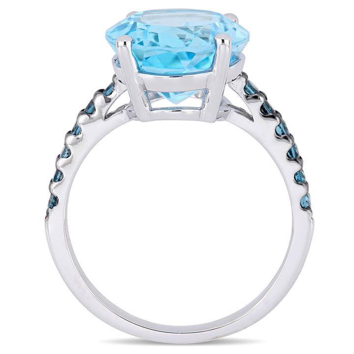 Sterling silver, 9-7/8 carat oval-cut sky-blue topaz, 3/5 carat round-cut London blue topaz (12 stones). Ring dimensions: 14.3 mm wide x 22.8 mm long x 7.8 mm high. Band: 2 mm wide.