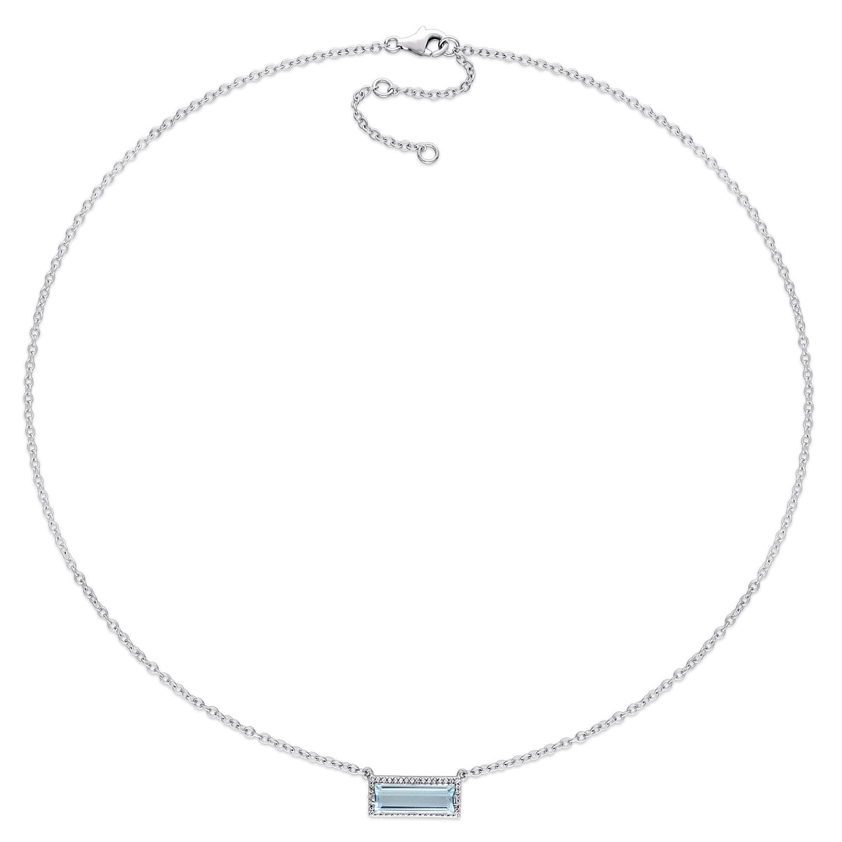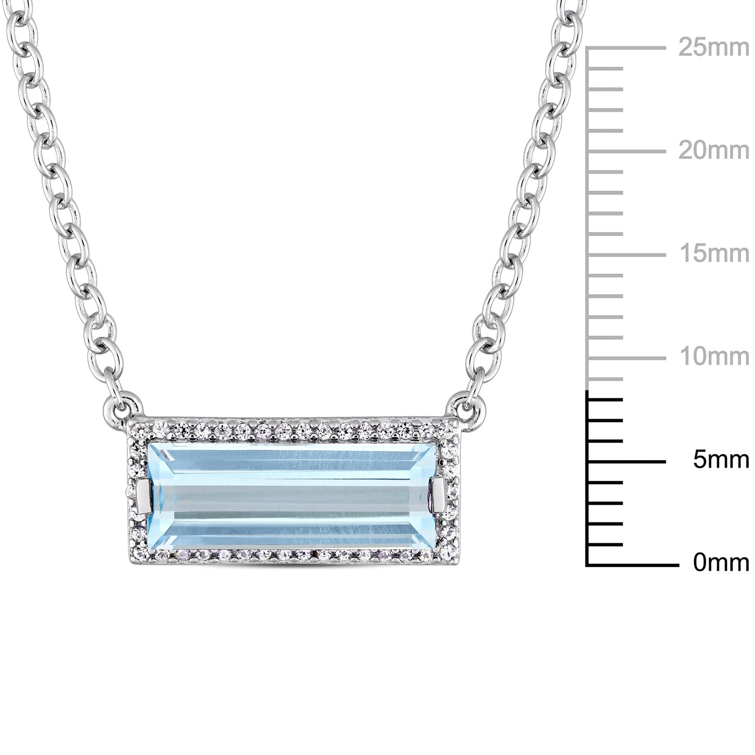 Crafted from sterling silver. Features 3ct total gemstone weight (TGW) of baguette-cut blue topaz (14x5mm) and round-cut white sapphires (42 stones). Chain length: 17 inches. Lobster clasp closure.