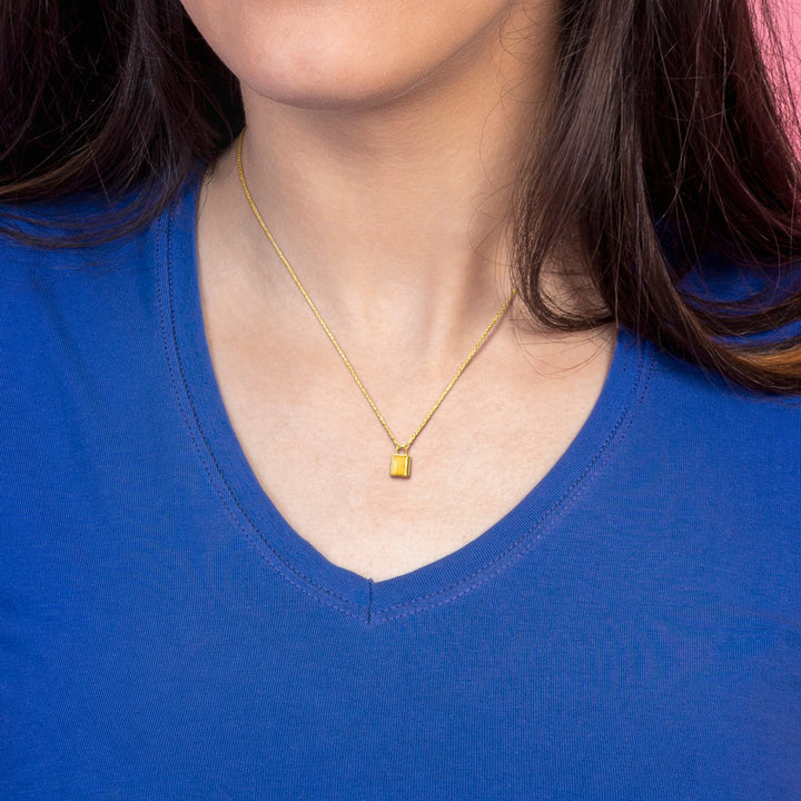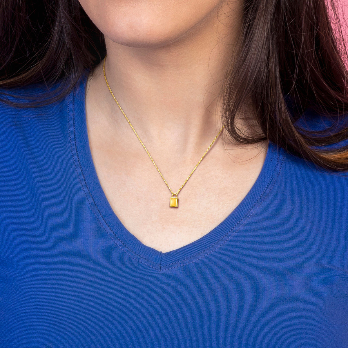 Made from 14K yellow gold, the necklace features a hollow padlock pendant on a 17-inch chain. The minimalist design ensures effortless styling for any occasion.