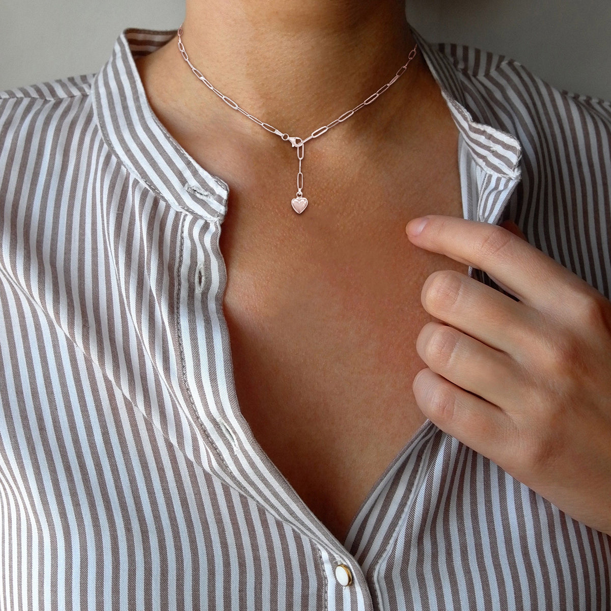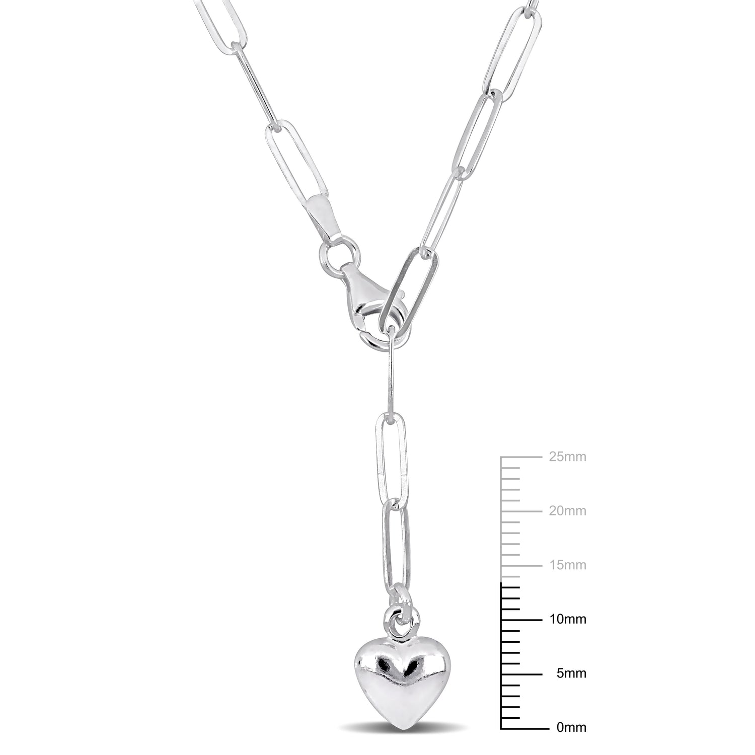 Sterling silver, 2.6mm heart charm, lariat-style, oval link chain, 16 inches.