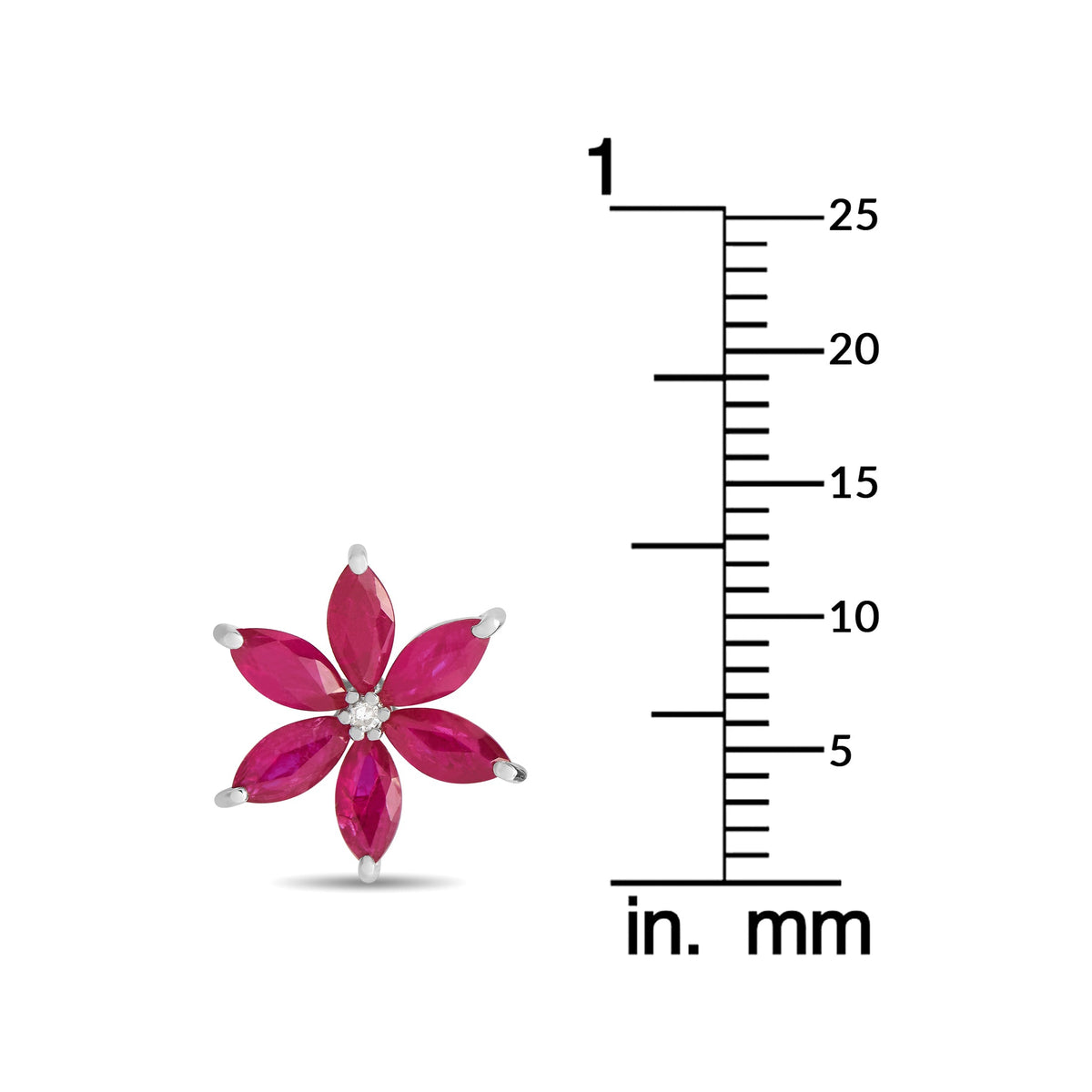 These LB Exclusive 14K White Gold 0.01ct Diamond and Ruby Flower Earrings combine the charm of nature with luxurious sparkle. The marquise-cut rubies form the delicate petals of the flower, with a brilliant diamond center, set in gleaming 14K white gold. The push-back closure ensures a secure fit, making these earrings a refined and timeless addition to any collection. These earrings convey elegance, grace, and the beauty of floral design.