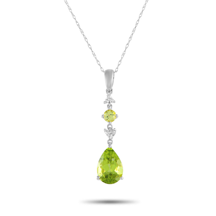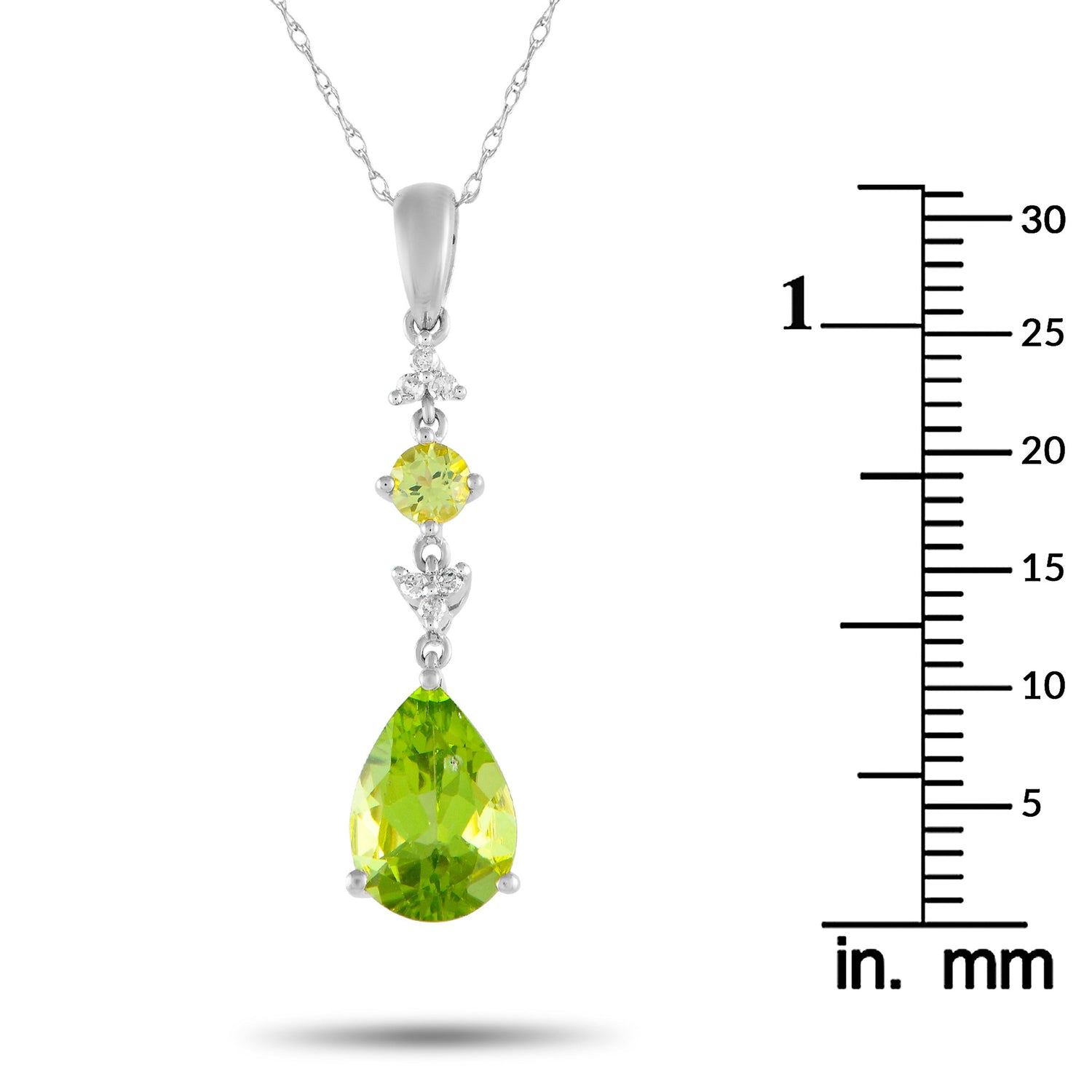 Crafted from 14K white gold, featuring 0.05ct total weight of diamonds and Peridot gemstones. Pendant dimensions: 1.25' x 0.25'. Chain length: 18 inches.