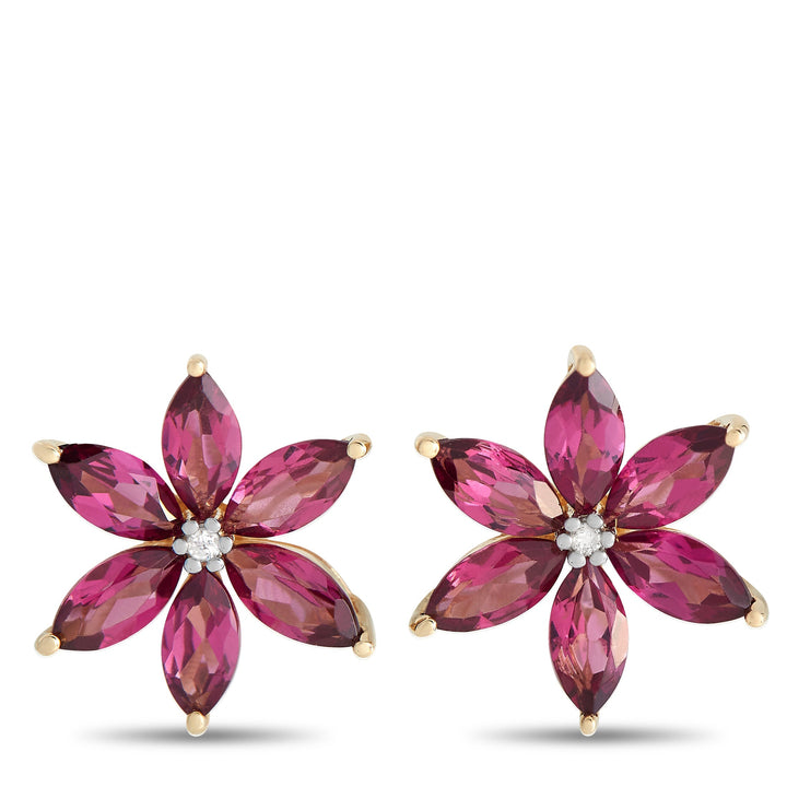 These LB Exclusive 14K Yellow Gold 0.01ct Diamond and Rhodolite Flower Earrings offer a subtle and feminine touch. The flower basket setting holds six marquise-cut rhodolite petals, while a diamond at the center adds a gentle sparkle. These delicate floral studs are perfect for adding a soft, romantic accent to any outfit. Whether worn for everyday elegance or special occasions, these earrings exude classic charm.