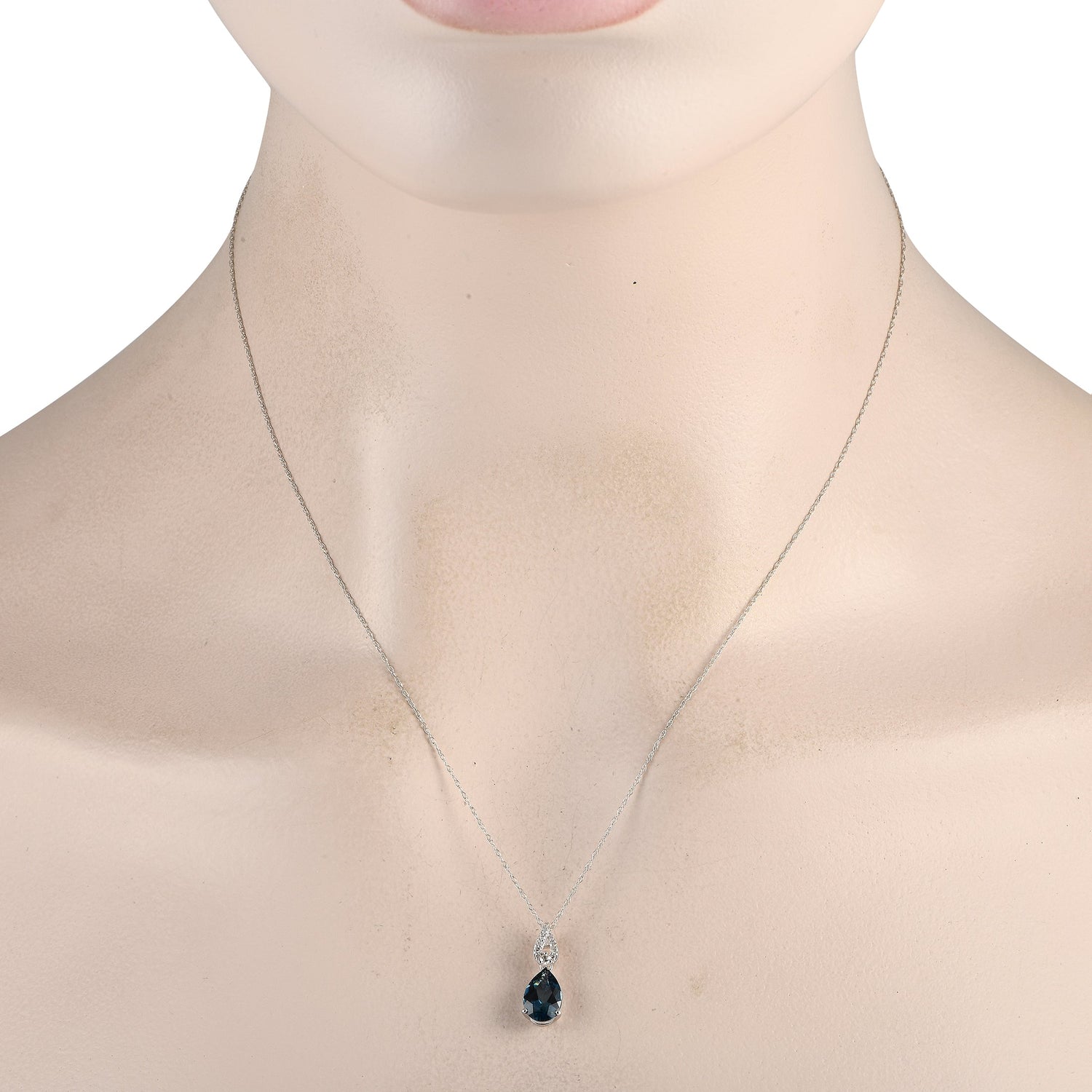 This LB Exclusive 14K White Gold 0.06ct Diamond and Pear-Cut Blue Topaz Necklace adds a touch of sophistication to any ensemble. The vivid blue of the pear-cut blue topaz is enhanced by a diamond-dotted link-style bail, adding an elegant sparkle. Suspended from an 18-inch cable chain crafted in 14K white gold, this necklace is a refined statement piece perfect for elevating both casual and formal looks. Whether worn for everyday elegance or special occasions, it embodies timeless beauty.