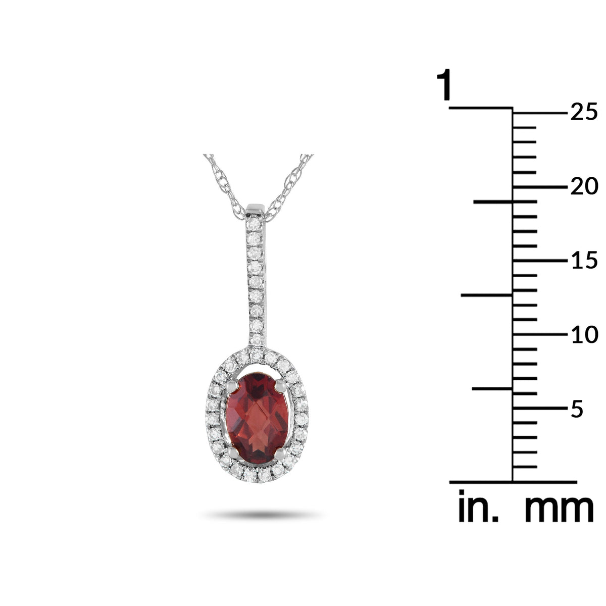Crafted in 14K white gold, featuring a 0.09ct total diamond weight and a garnet center stone. Pendant measures 0.75 inches long by 0.25 inches wide, suspended from an 18-inch chain.