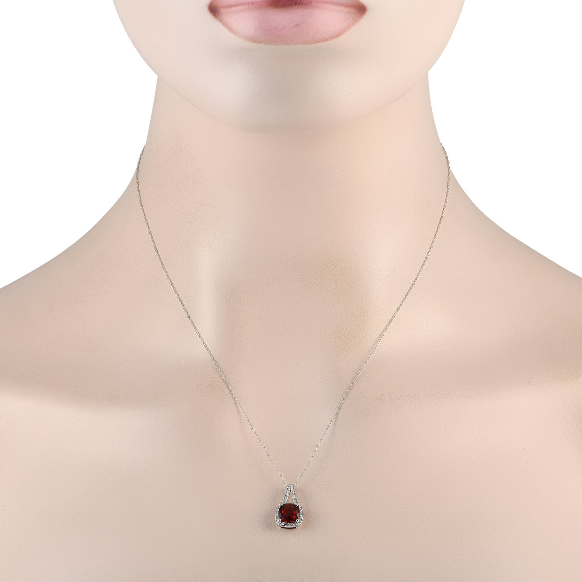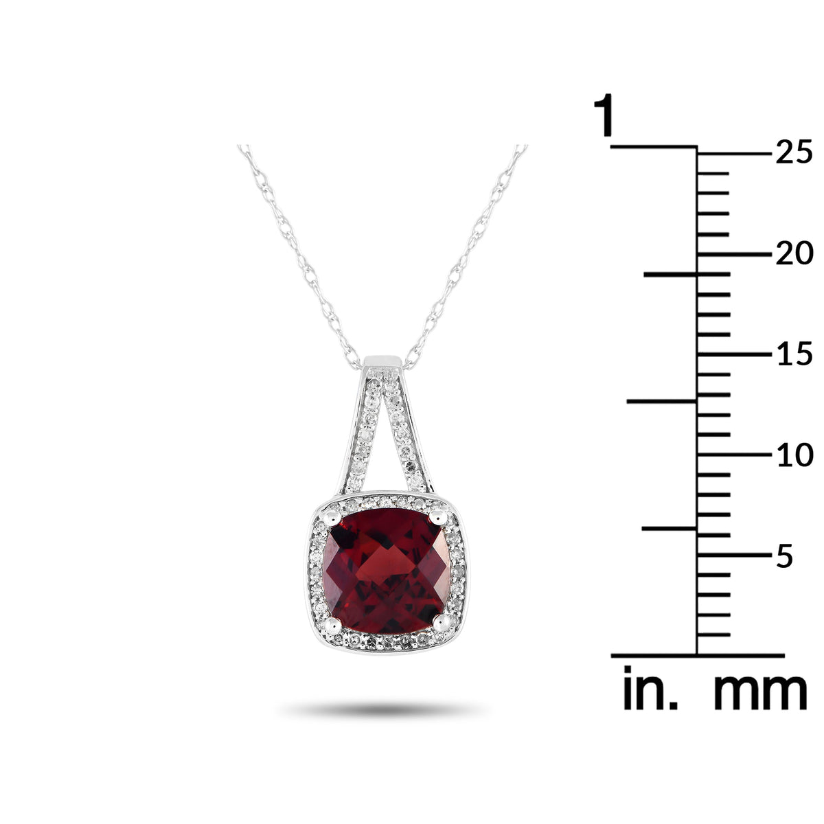 Crafted in 14K white gold with a 0.12ct diamond and a garnet gemstone (0.65 x 0.45 inches). Pendant suspended from an 18-inch cable chain with a spring ring clasp.