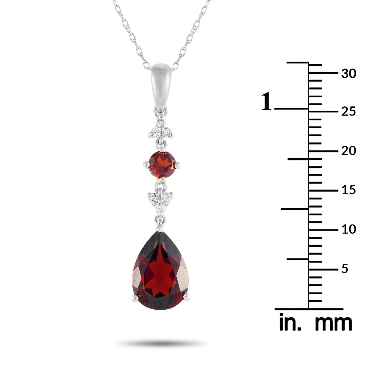 14K white gold, 0.05 carats of diamonds, garnet gemstone, 18-inch chain.