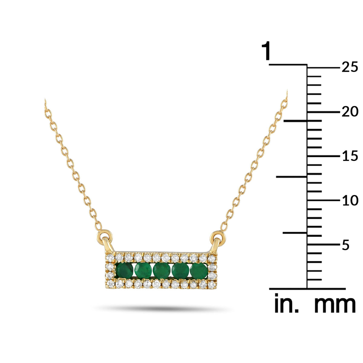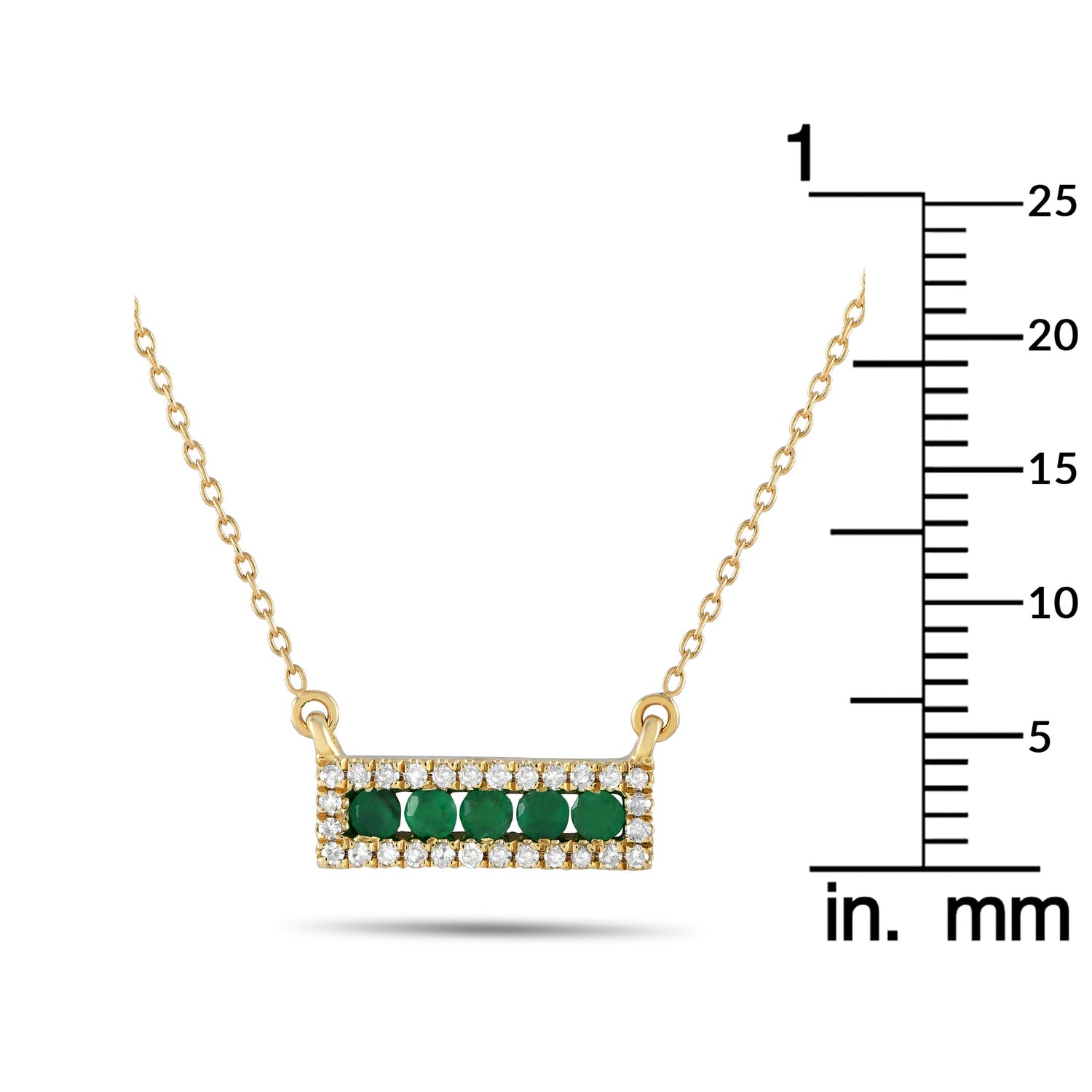 14K yellow gold, 0.15 carats of diamonds, emeralds, 18-inch chain.