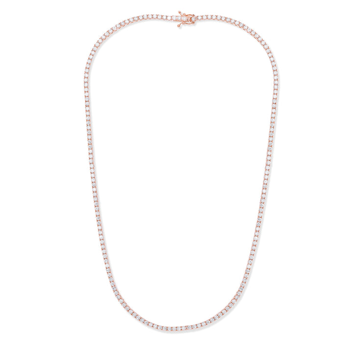 This Classic Straight Diamond Tennis Necklace by Diana M epitomizes timeless glamour and sophistication. Expertly crafted in luminous 14-karat yellow gold, the necklace showcases an impressive 6.25 carats of radiant diamonds meticulously set in a secure and classic four-prong design. The epitome of elegance, this necklace beautifully frames the neckline with continuous sparkle, ideal for special occasions or as a luxurious daily statement. A true testament to Diana M's meticulous craftsmanship and refined style.