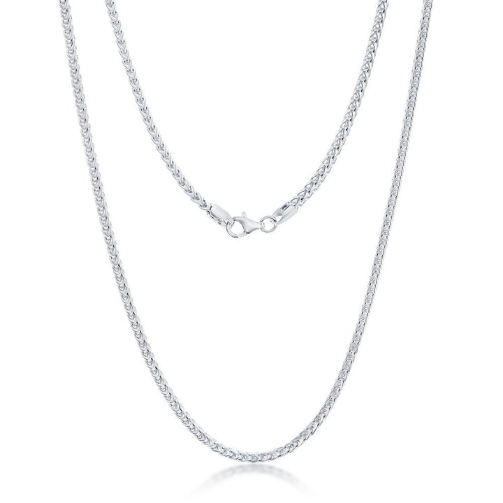 This Diamond Cut Franco Chain 2.5mm Sterling Silver 36' Necklace by Simona features a beautifully crafted Franco chain, known for It's distinctive interlocking links that create a smooth, durable design. The chain measures 2.5mm in width and 36' in length, making it ideal for wearing with pendants or layering with other necklaces. A perfect addition to any jewelry collection.
