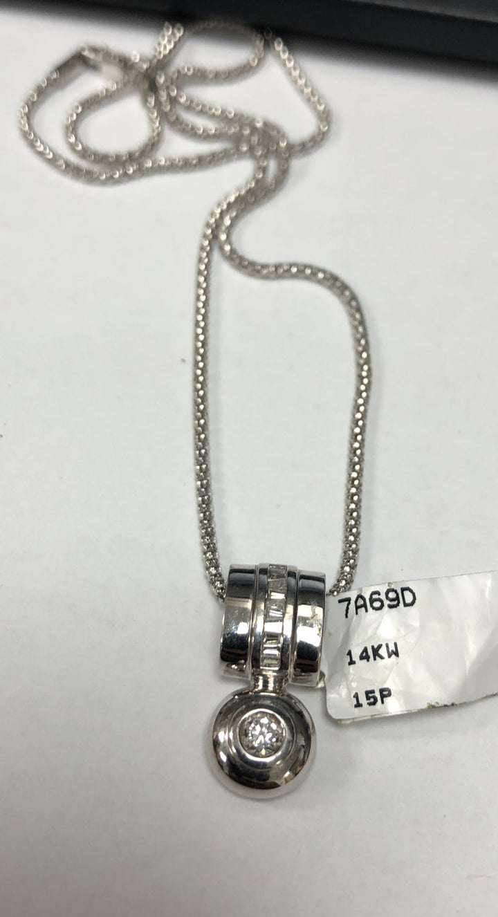 14kt white gold diamond pendant featuring 0.30 cts of round and baguette diamonds