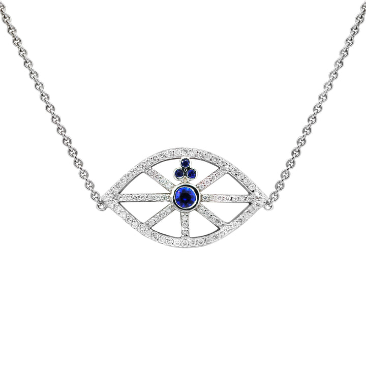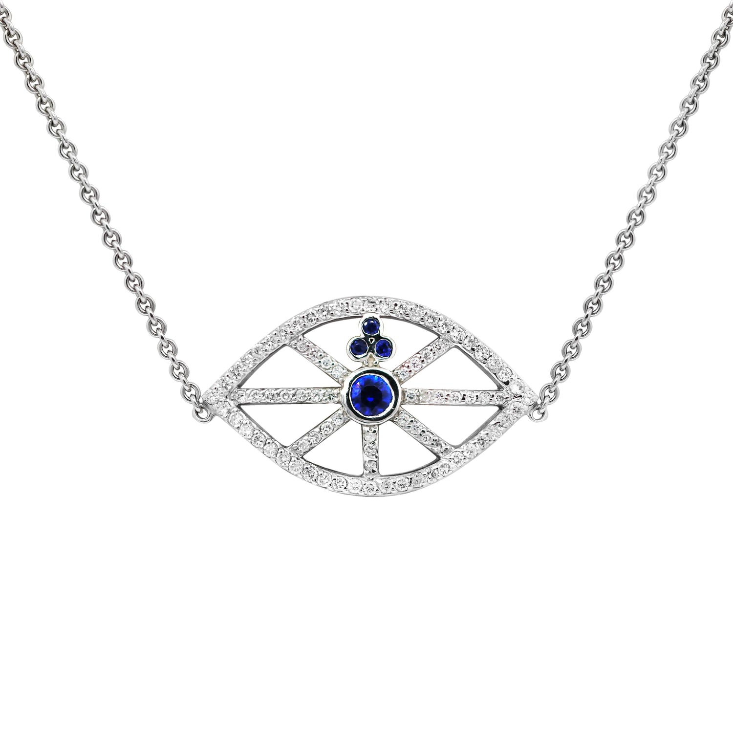 Crafted in 18K white gold with 1.00ct total diamond weight. Features sapphire gemstones in an eye-shaped pendant design.