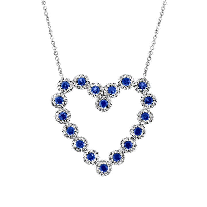 Crafted in 14K white gold with 0.79ct blue sapphires and 0.55ct white diamonds. Heart-shaped pendant design.