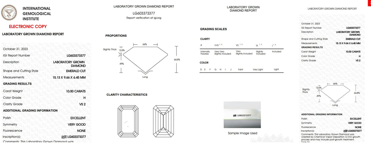 Crafted from 14k yellow gold with 14k white gold prongs. Features a 10ct emerald cut lab-grown diamond (H color, VS2 clarity). IGI certificate included.