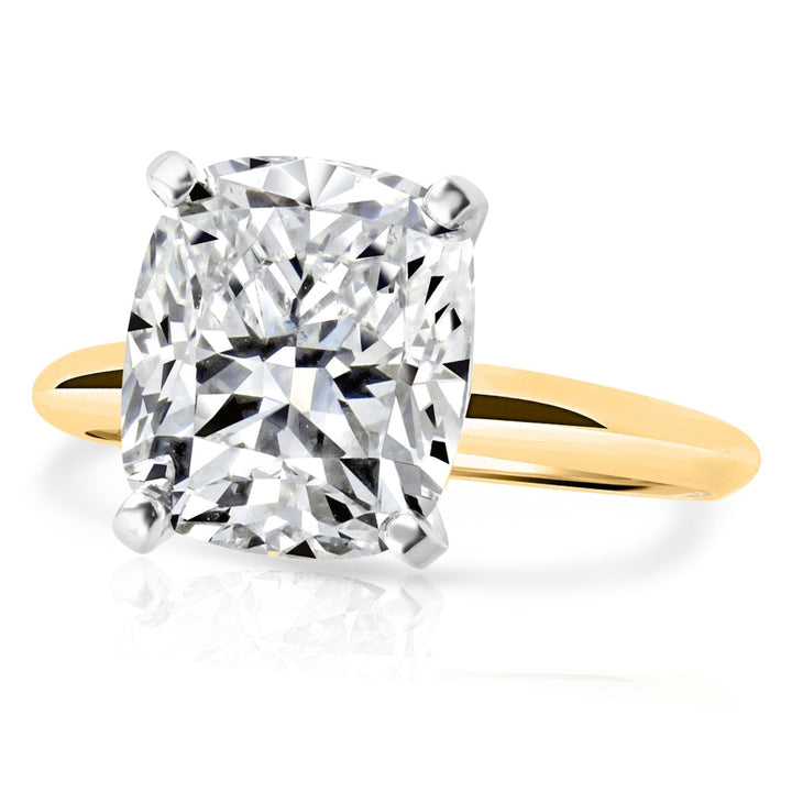 Solid 14k yellow gold with a 5Ct cushion cut certified lab-grown diamond. Four-prong setting. Finger size 6.5 (can be resized).