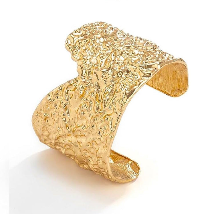 Crafted in 18K gold-plated metal with a hammered finish. Inner diameter measures 2.35 inches; flexible design accommodates most wrist sizes.