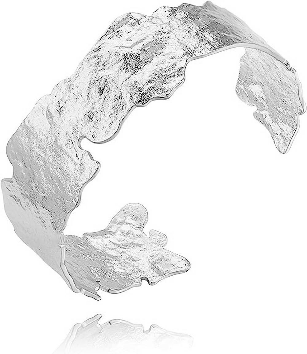 Crafted in 18K gold-plated metal with a hammered finish. Inner diameter measures 2.35"; flexible design comfortably fits most wrists.