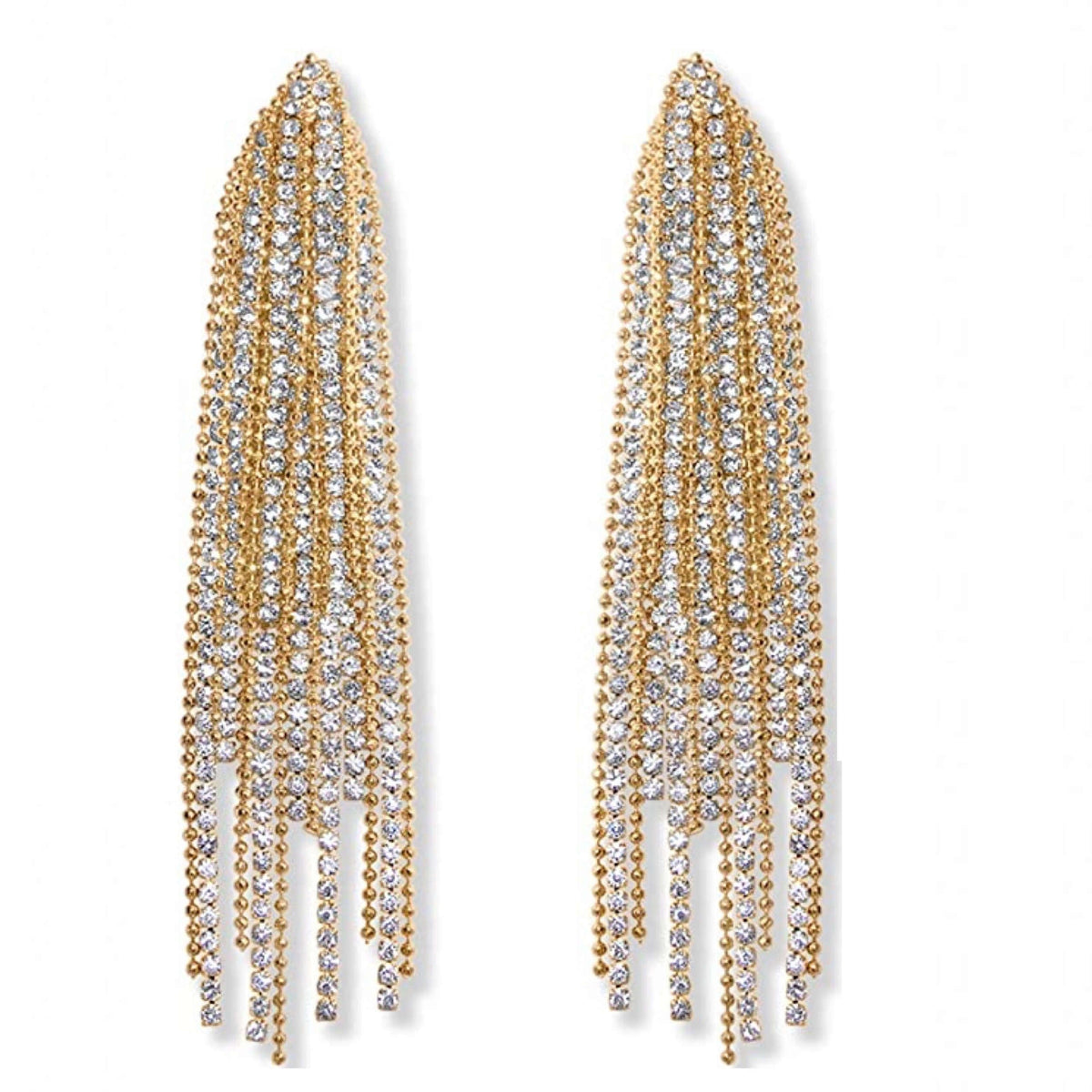18k gold-plated chandelier earrings measuring 3.5 inches long with intricate embellishments.