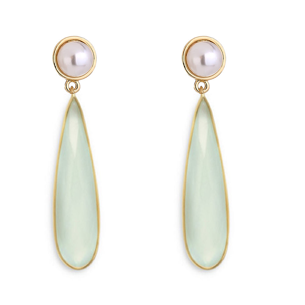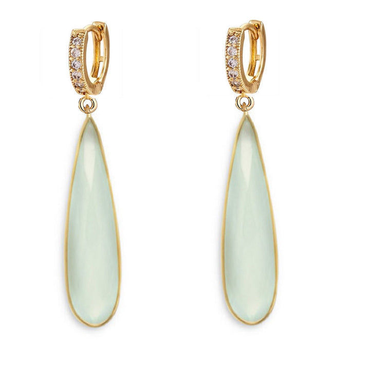 Crafted in 18k gold plating featuring chalcedony gemstones. Earrings measure 2.65 inches in length.