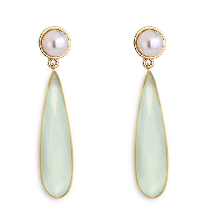 These 18K Chalcedony Drop Earrings by Liv Oliver offer tranquil elegance with a touch of luxury. Featuring soothing chalcedony gemstones suspended from lustrous 18k gold-plated settings, these earrings provide serenity and style, perfect for adding a calming presence to your ensemble.