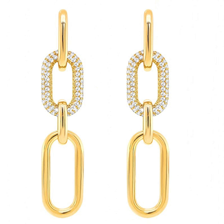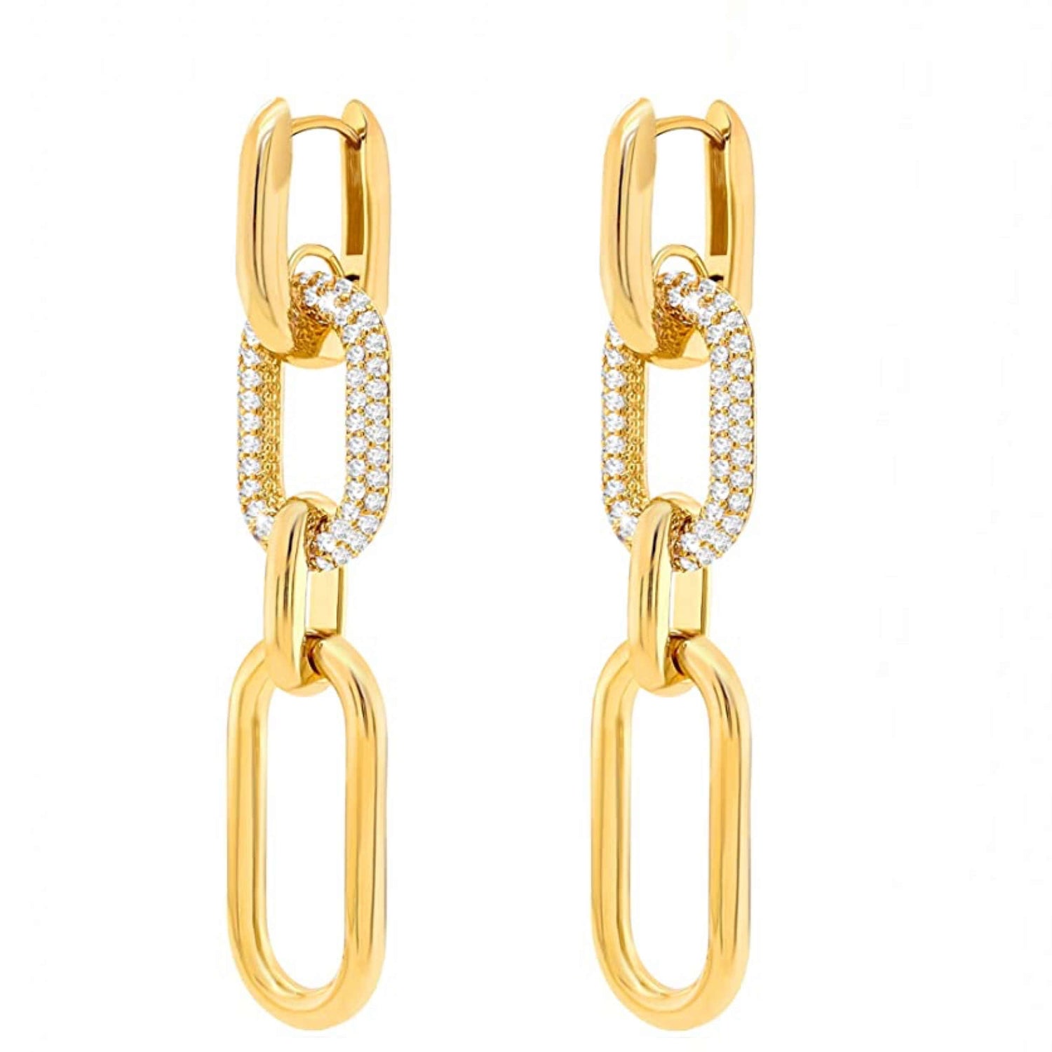 Crafted from 18k gold-plated metal with embellished oval link design. Earrings measure approximately 2 inches long.