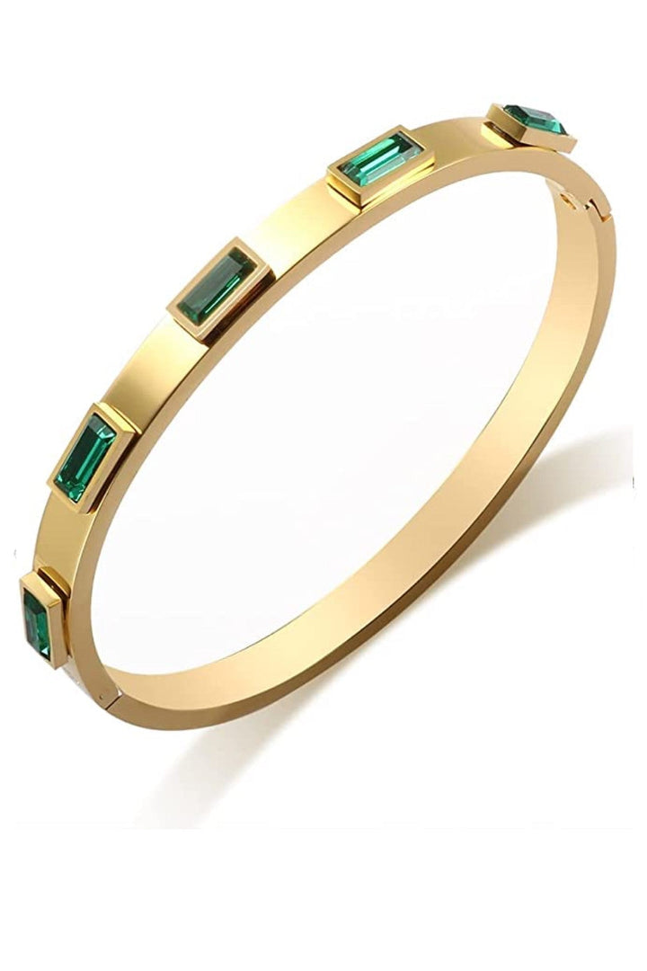 This 18K Gold Plated Green Station Bangle by Liv Oliver is a sleek, sophisticated accent piece. The bright gold plating and elegant green stations make it perfect for elevating both casual and formal outfits.