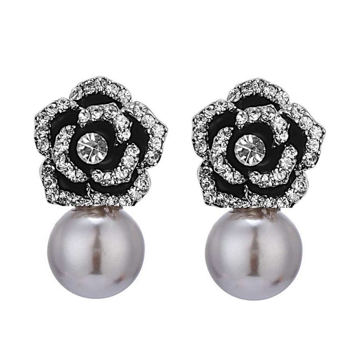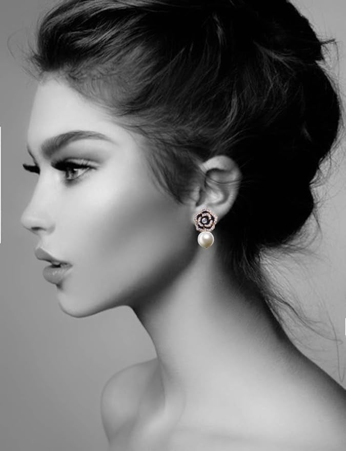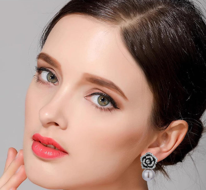 These Black Rose Embellished Pearl Drop Earrings by Liv Oliver are an elegant fusion of floral design and timeless pearl beauty. Perfect for special occasions, they offer a graceful and luxurious finishing touch.