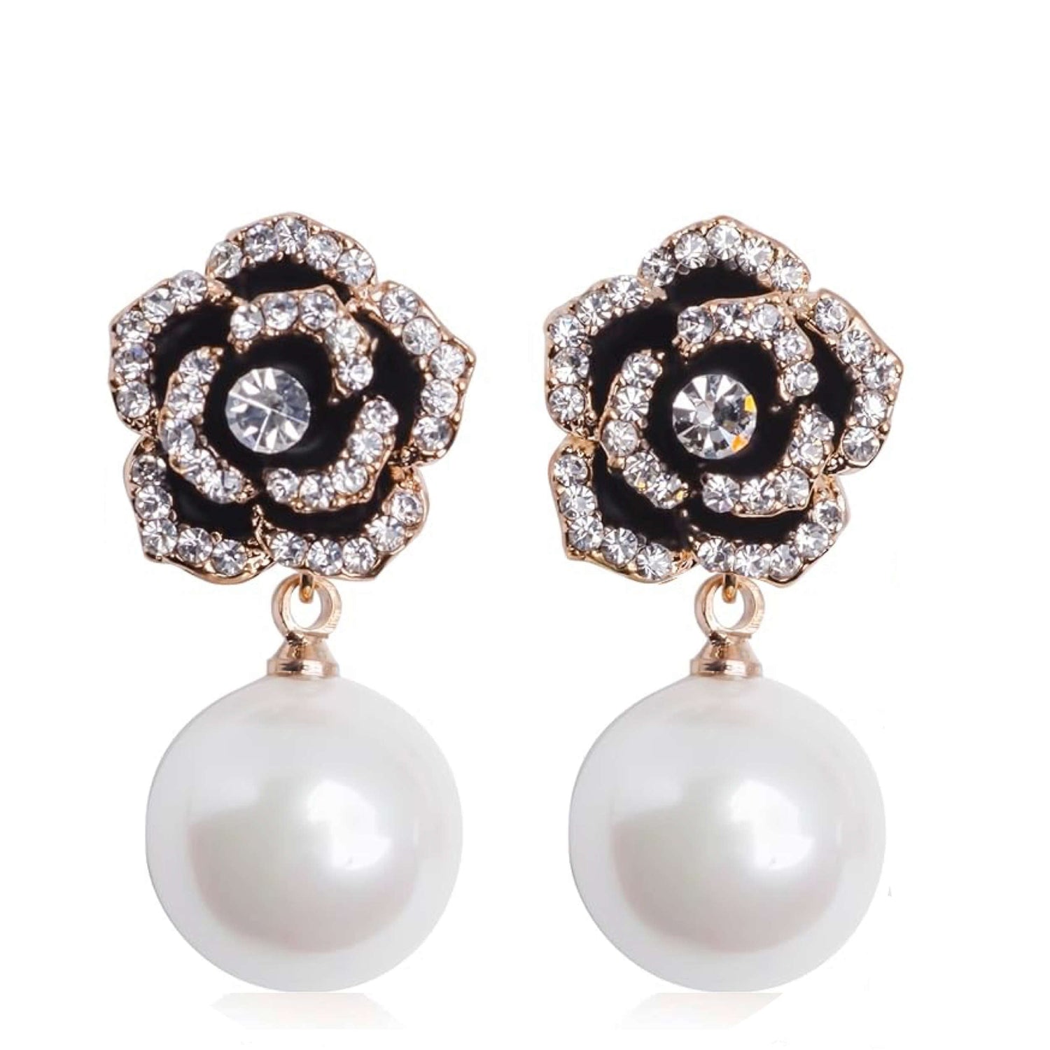 18K Gold Black Rose Embellished Pearl Drop Earrings