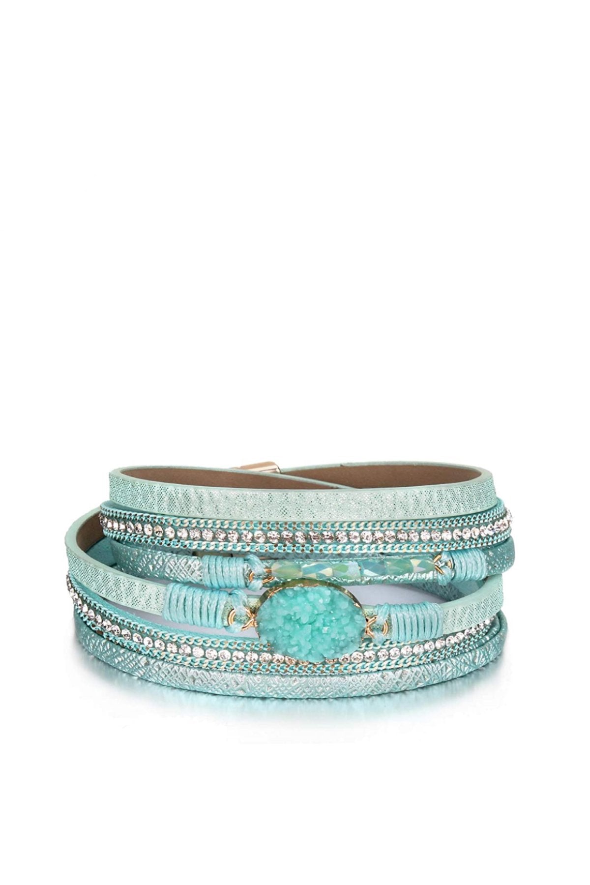 This 18K Gold Aqua Blue Quartz Multi Wrap Bracelet by Liv Oliver is vibrant and playful, with aqua blue druzy quartz and crystals creating a bold statement. Perfect for adding color and texture to your jewelry stack or wearing as a standout piece.