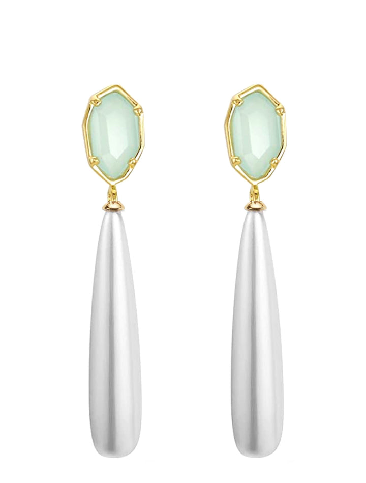 18k gold-plated earrings featuring sea-green stones and pearls. Earrings measure 2.75 inches long.