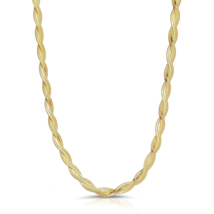This 18K Gold Woven Goddess Necklace by Liv Oliver is a bold statement of refined elegance. It's intricate woven texture captures light and adds rich dimension to any ensemble. Whether worn with a sleek dress or layered over a blouse, this piece is designed to turn heads and evoke modern luxury.